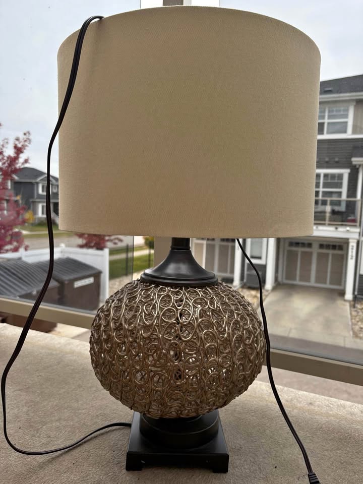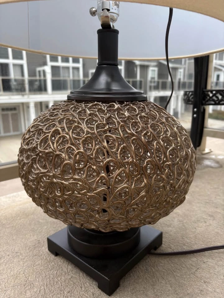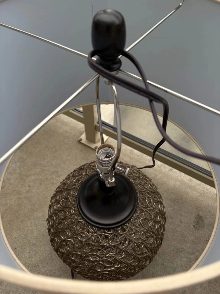 A maze of rich bronze resin sits a top a matching metal base and is finished with a lush trimless linen shade and matching oval finial.