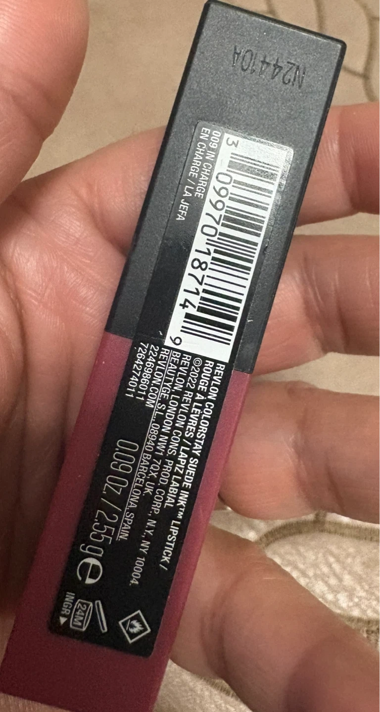 This is the Revlon ColorStay Suede Ink Lipstick in the shade 009, "In Charge." It's a matte liquid lipstick that provides long-lasting wear. The formula is designed for comfort and a smooth application.