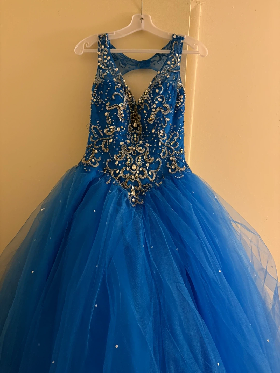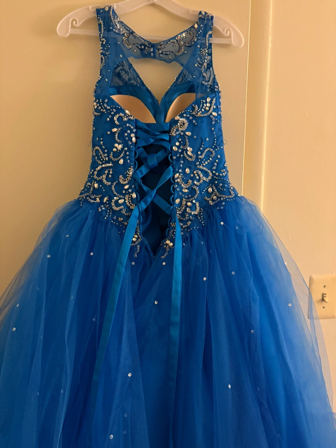 Stunning royal blue ball gown, perfect for prom or any formal event! It features intricate beading on the bodice and a full, layered tulle skirt with sparkling sequins. The back has a lace-up corset closure for a customized fit. This dress is sure to make a statement!
