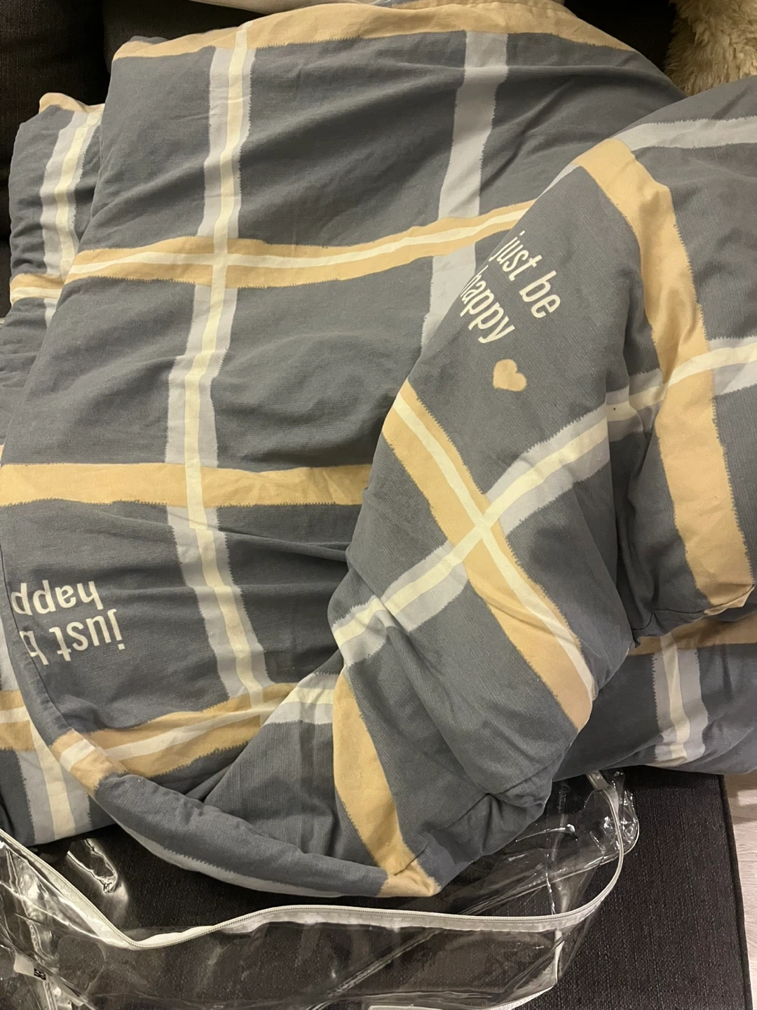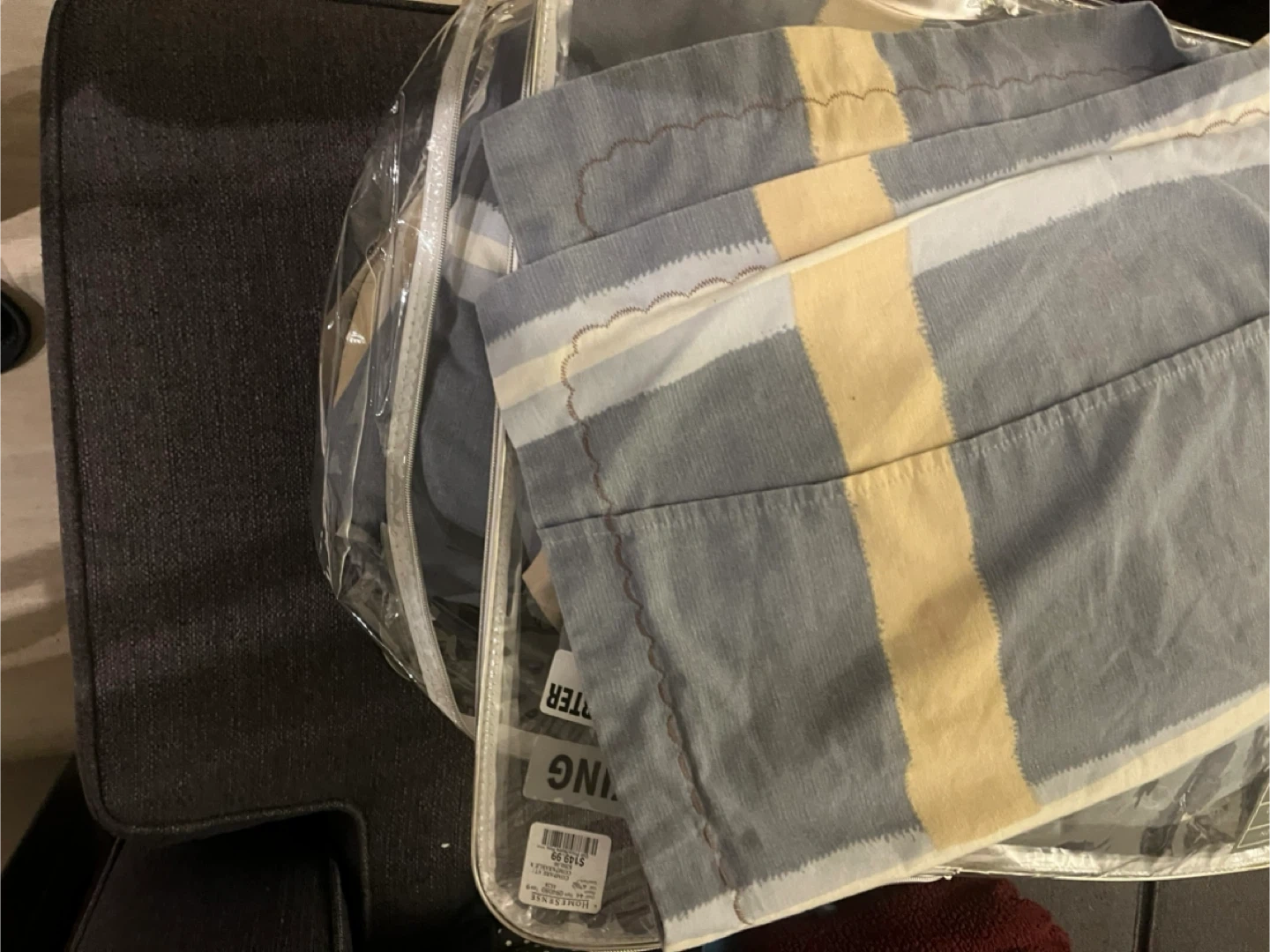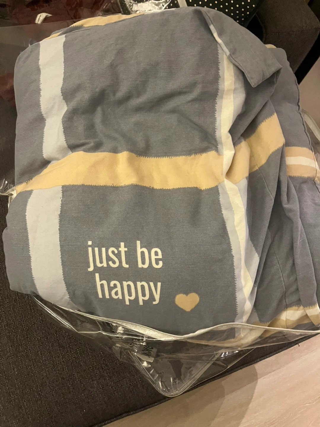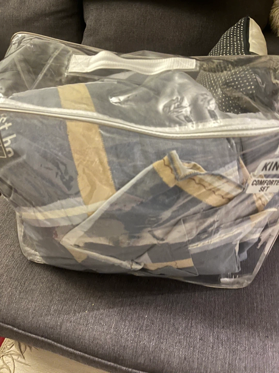 Grey and yellow striped king comforter set. It's 100% cotton and comes in its original packaging. Perfect for adding a cozy touch to your bedroom!