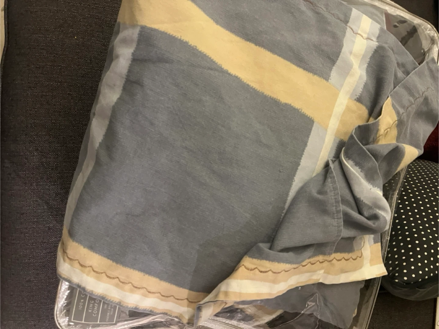 Grey and yellow striped king comforter set. It's 100% cotton and comes in its original packaging. Perfect for adding a cozy touch to your bedroom!