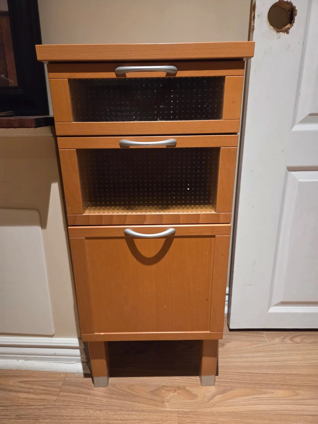 This wooden cabinet features two drawers with frosted glass fronts and one lower cabinet door. It has silver handles and stands on four legs with silver caps. The wood finish is a light, natural tone.