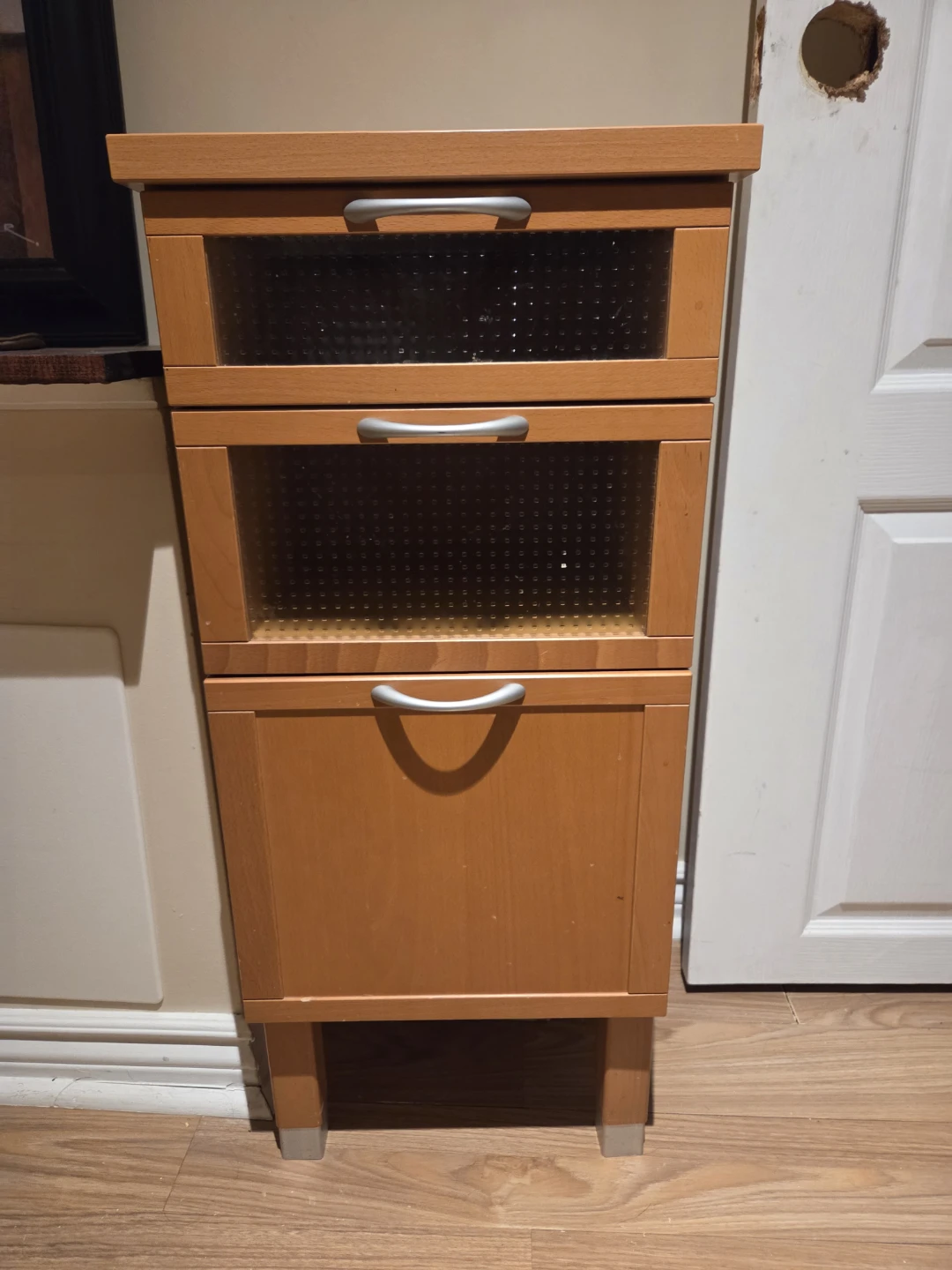 This wooden cabinet features two drawers with frosted glass fronts and one lower cabinet door. It has silver handles and stands on four legs with silver caps. The wood finish is a light, natural tone.