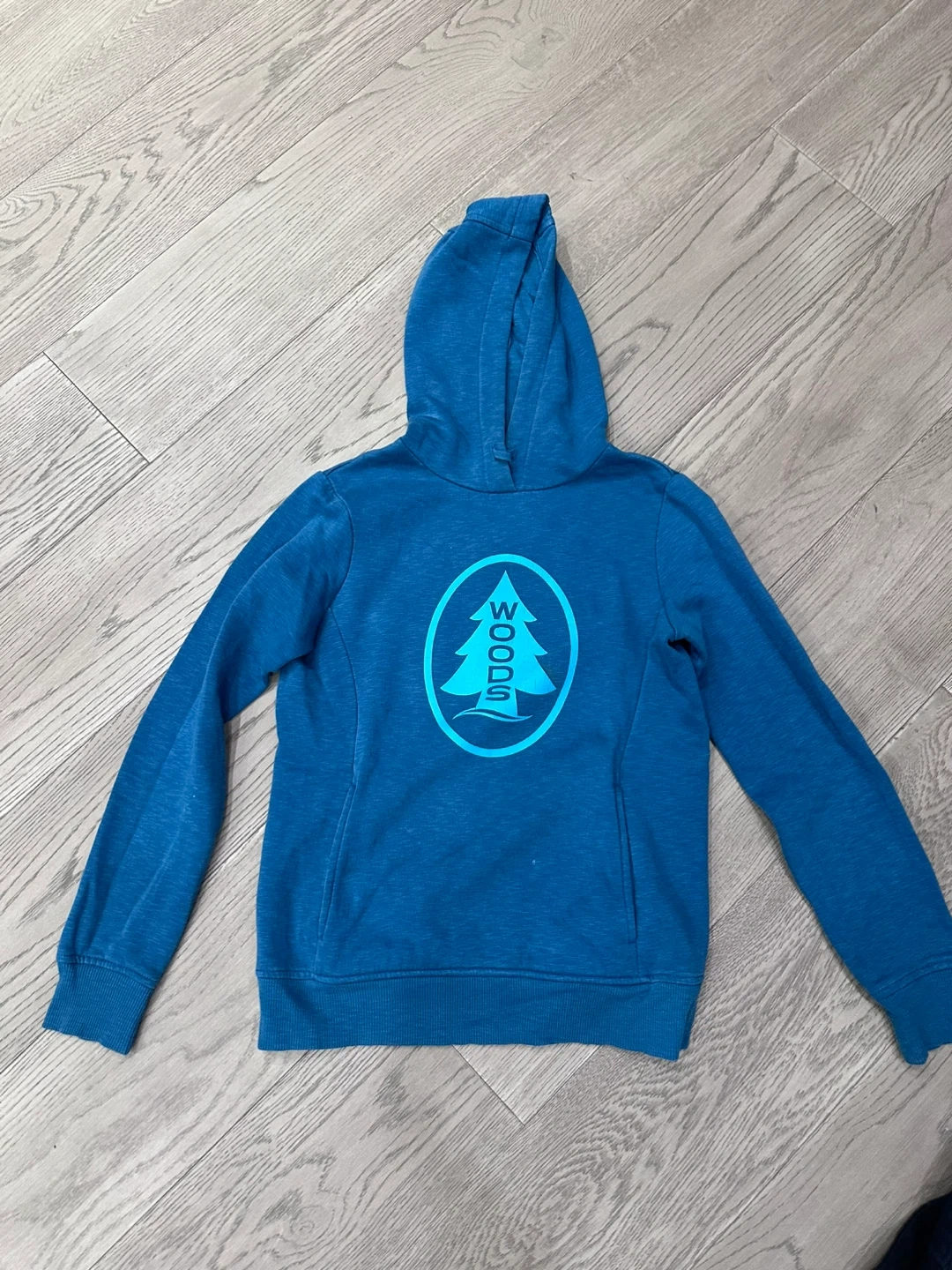 A blue Woods brand hoodie with a tree logo. It's made for comfort and casual wear. This hoodie is perfect for keeping cozy on cooler days.