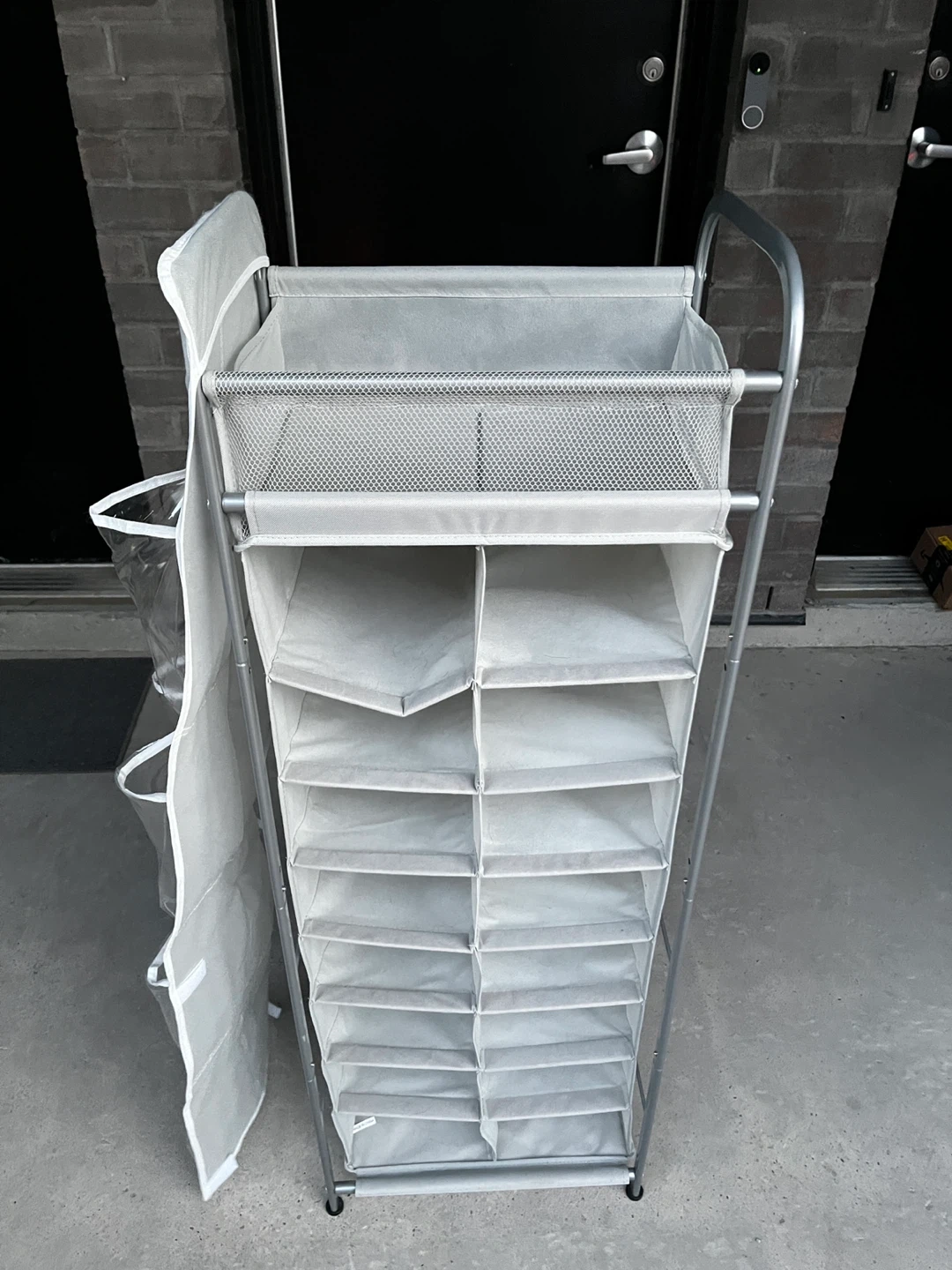 Looking to declutter your entryway? I'm selling a handy rolling shoe rack organizer! It features multiple shelves for shoes and side pockets for accessories. It's in great shape and ready to help you keep your space tidy