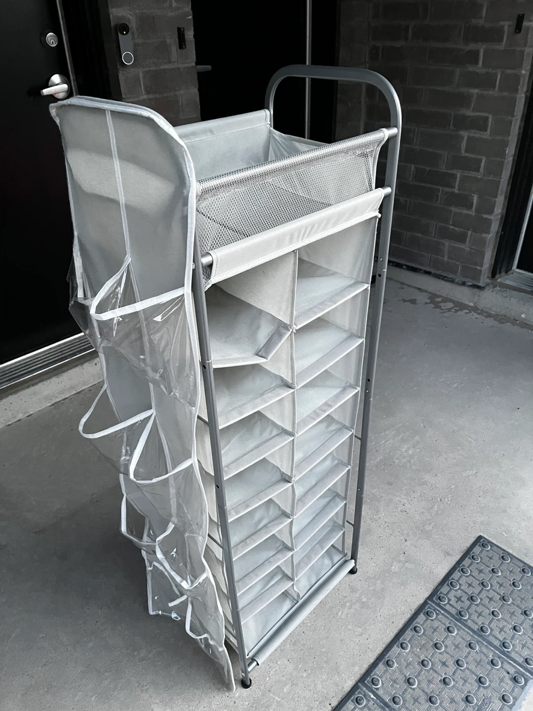 Looking to declutter your entryway? I'm selling a handy rolling shoe rack organizer! It features multiple shelves for shoes and side pockets for accessories. It's in great shape and ready to help you keep your space tidy