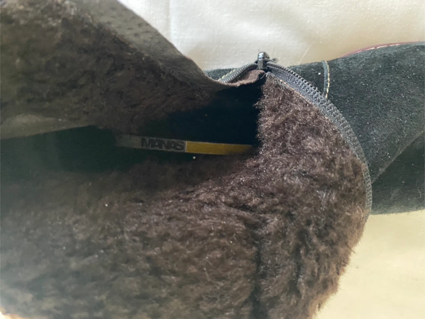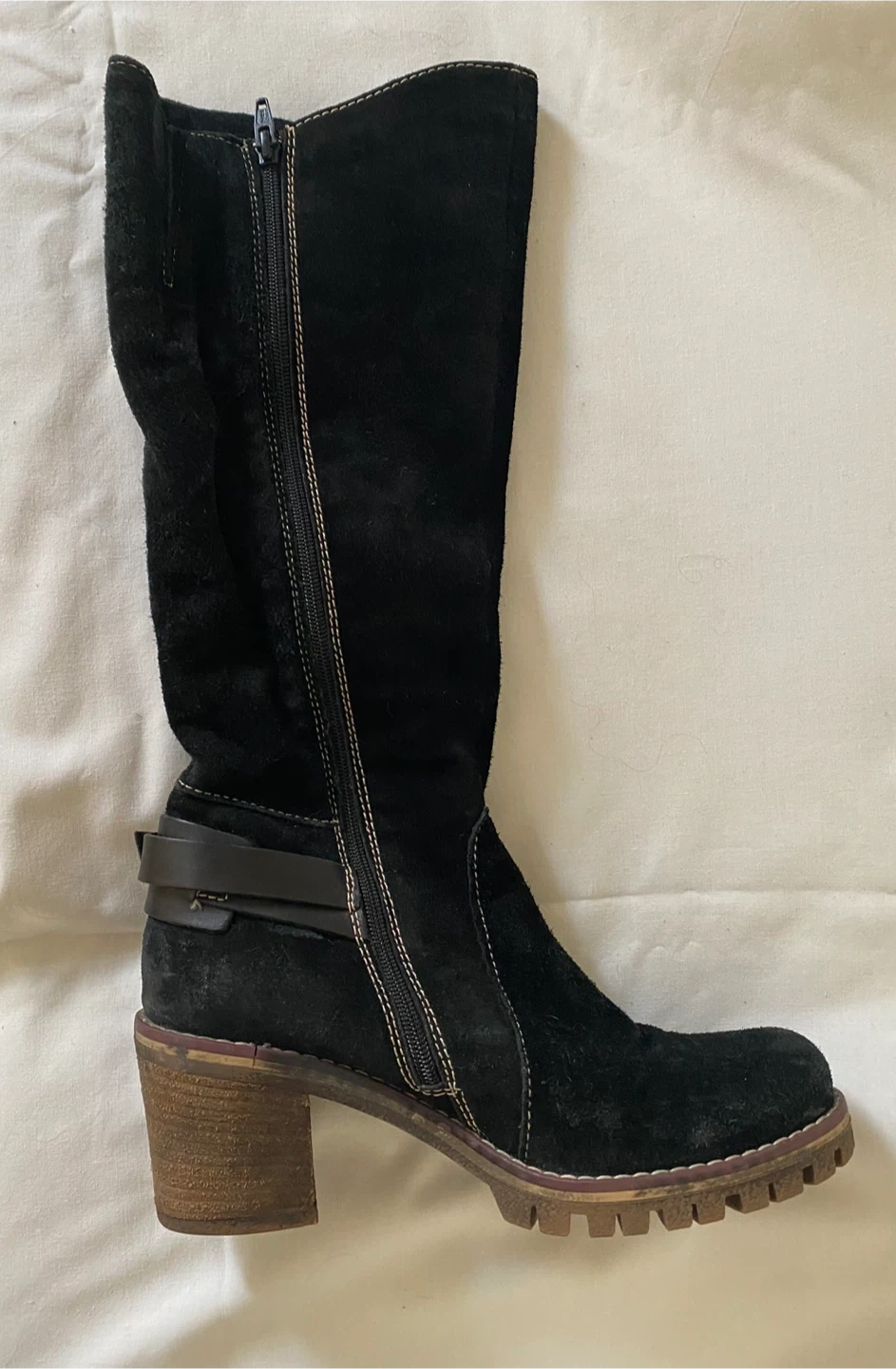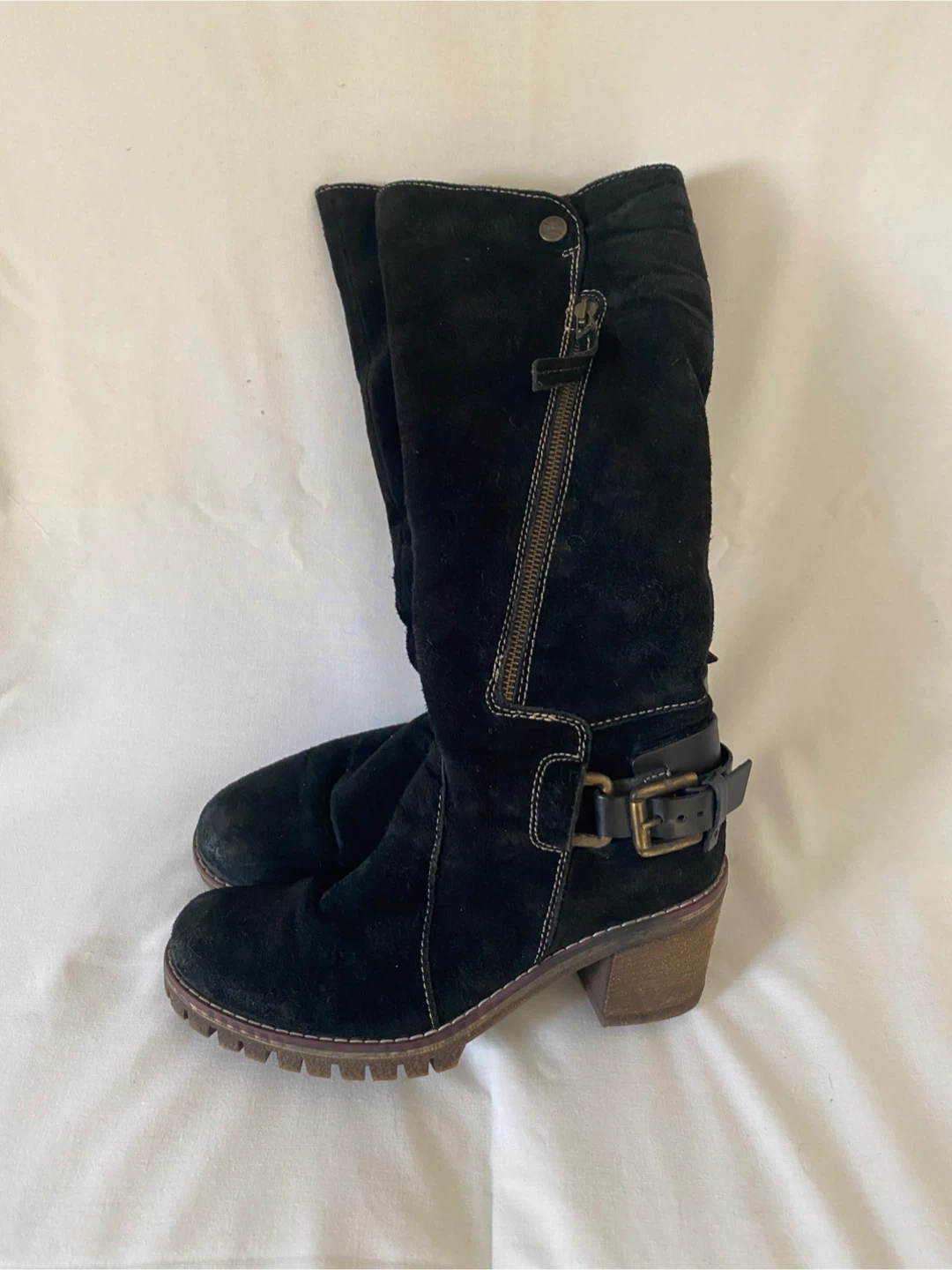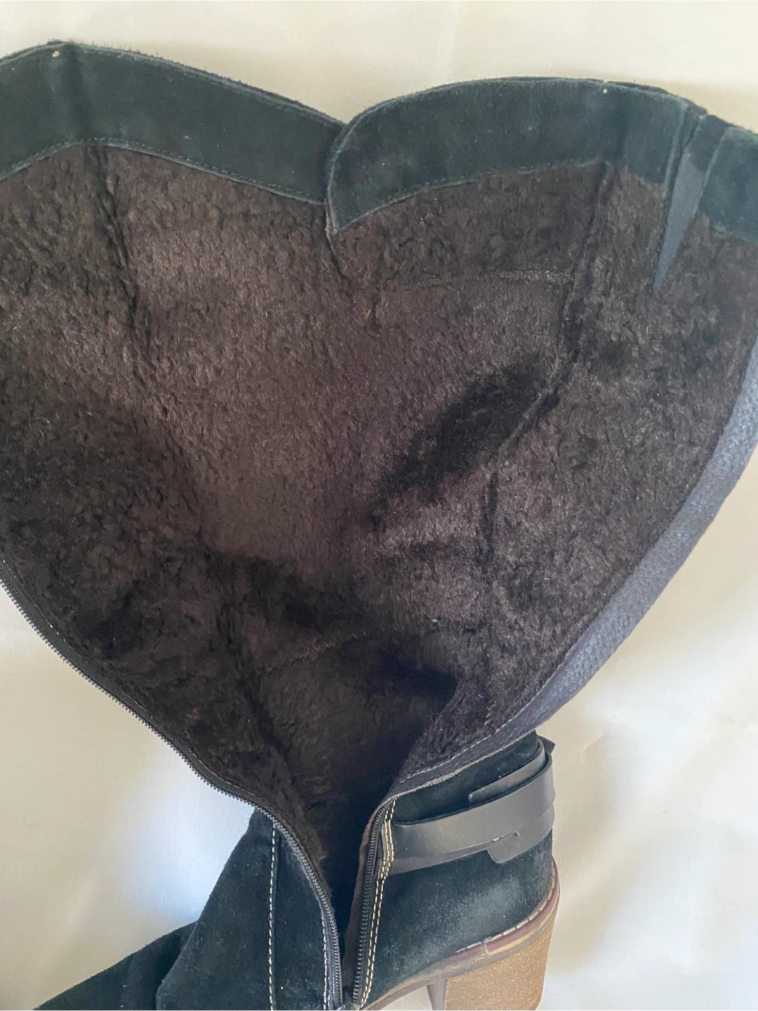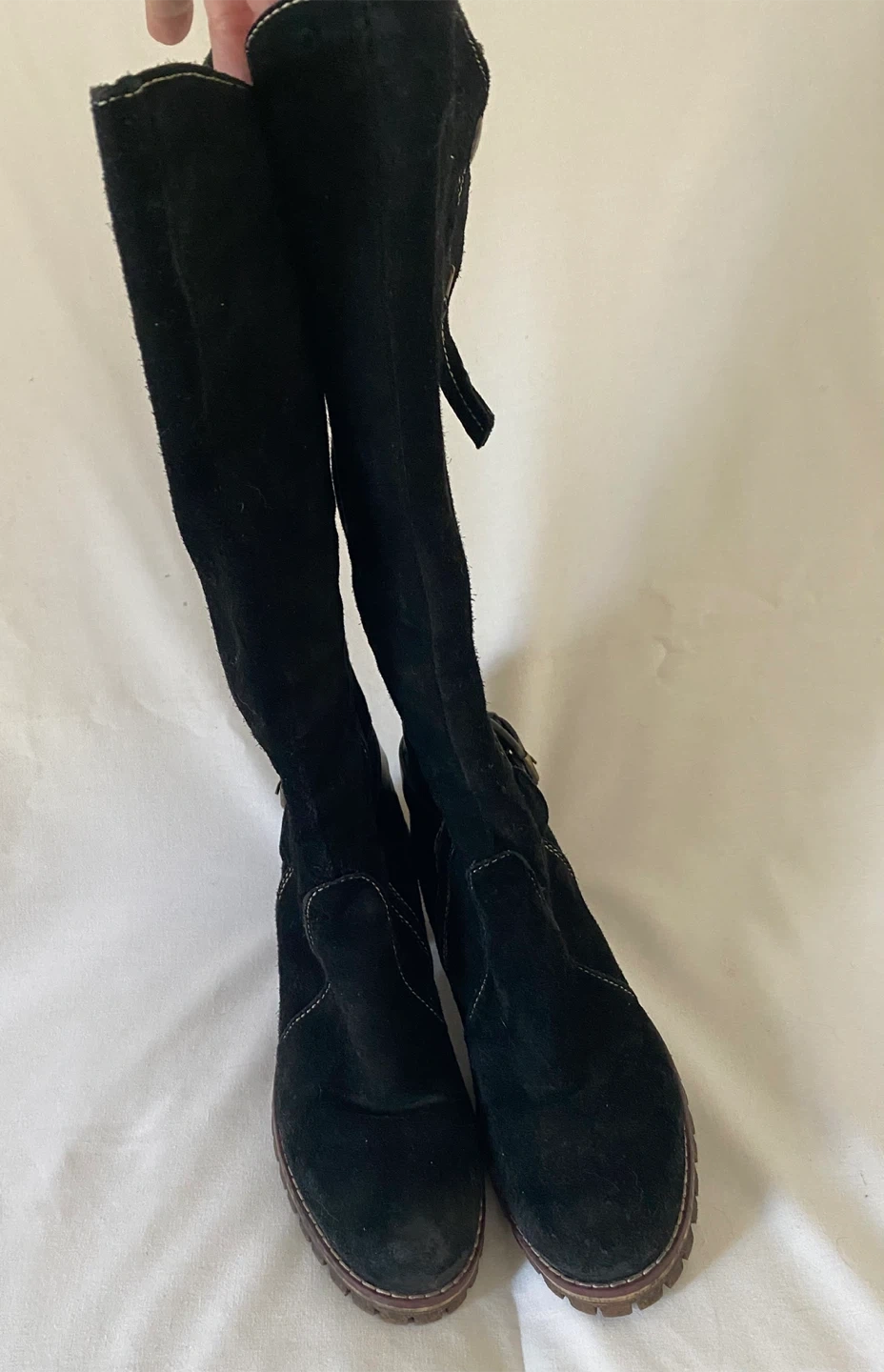 MANAS Black suede tall boots with a side zipper closure. Features a decorative buckle strap detail and a chunky heel. These boots have a cozy interior lining.