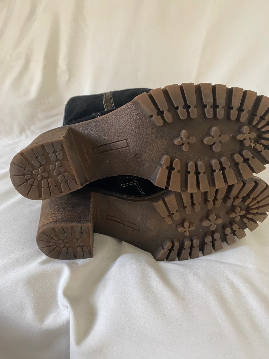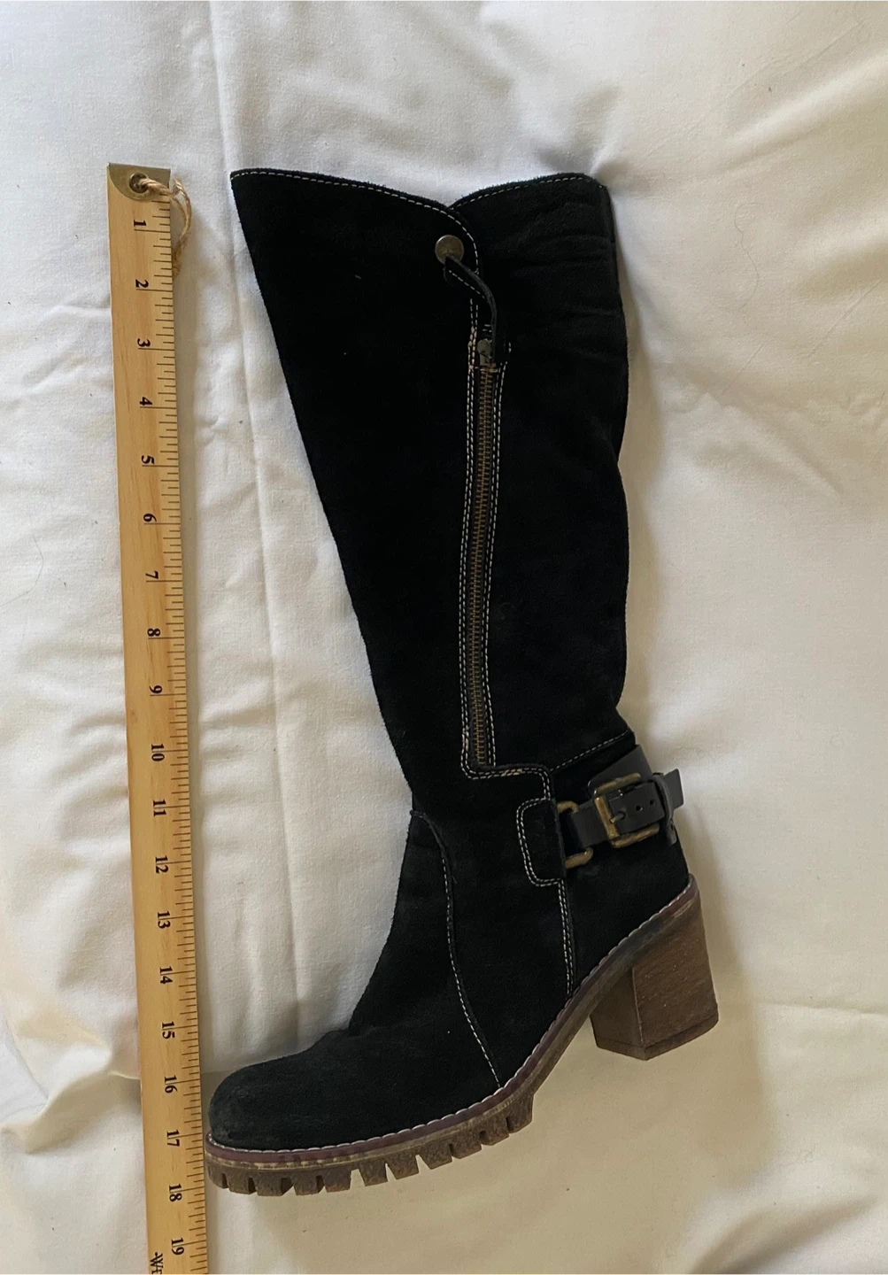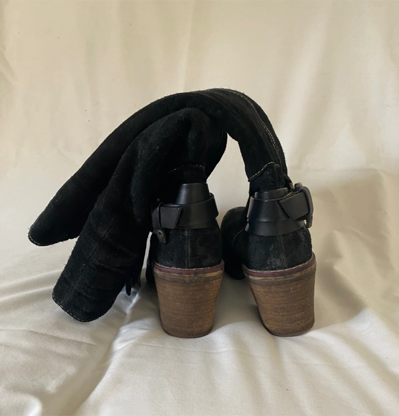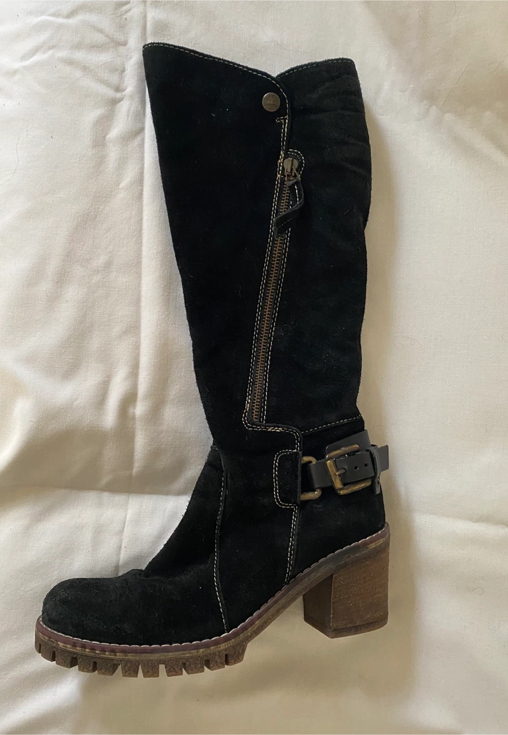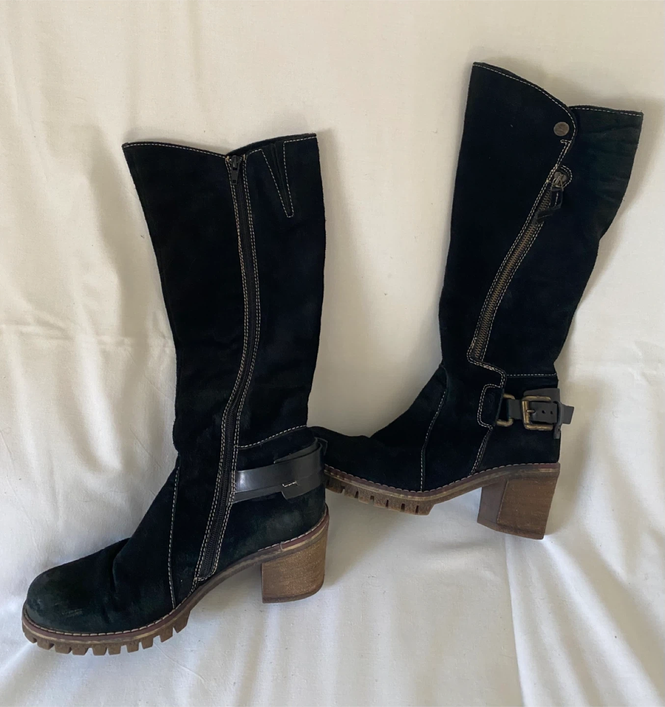 MANAS Black suede tall boots with a side zipper closure. Features a decorative buckle strap detail and a chunky heel. These boots have a cozy interior lining.