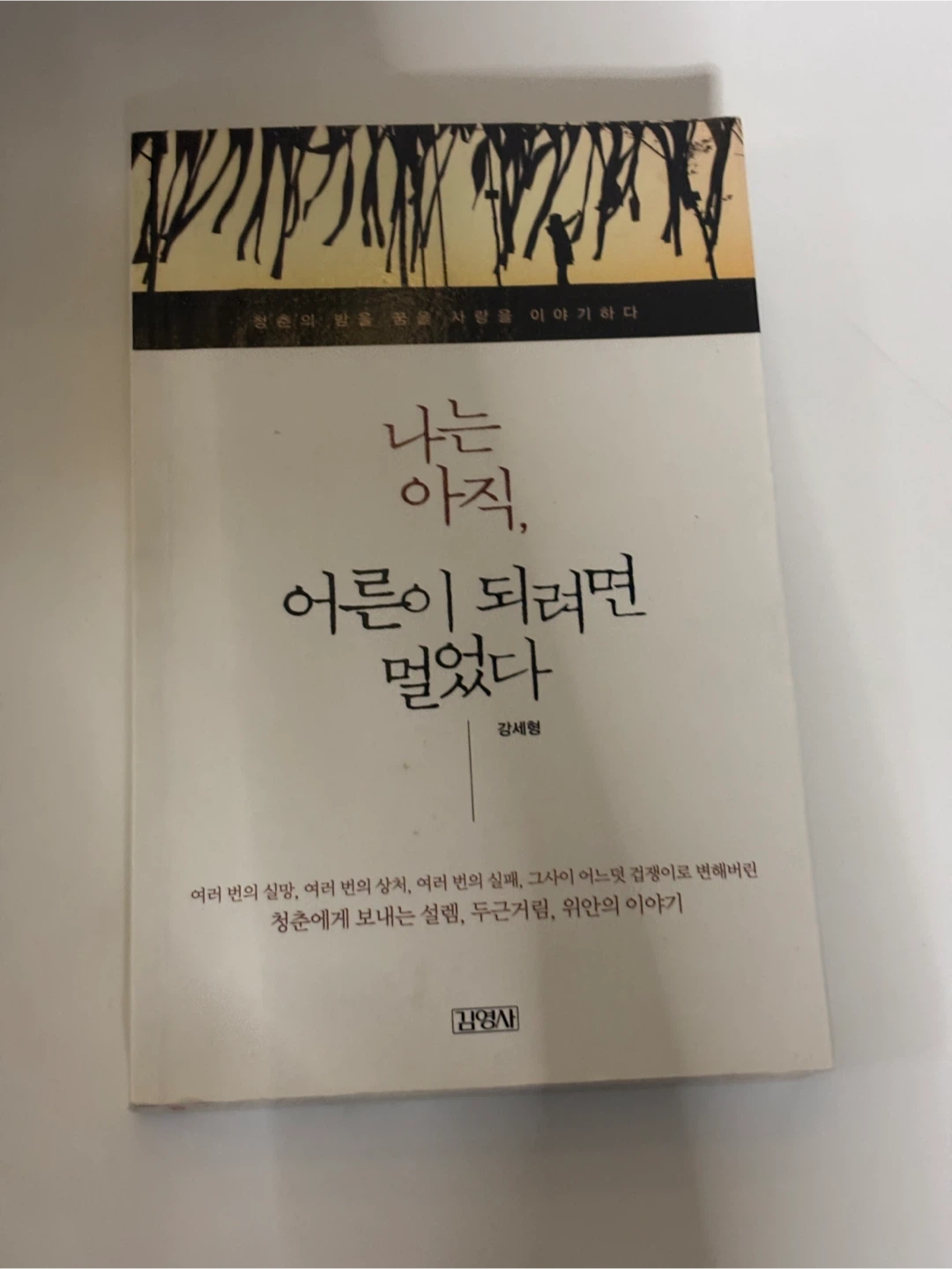 This book is titled 'I Am Still Far From Becoming an Adult' and is written by Kang Se-hyung. It's a collection of stories about excitement, nervousness, and comfort sent to youth, covering many disappointments, hurts, and failures. This book would be useful for young adults navigating life's challenges.