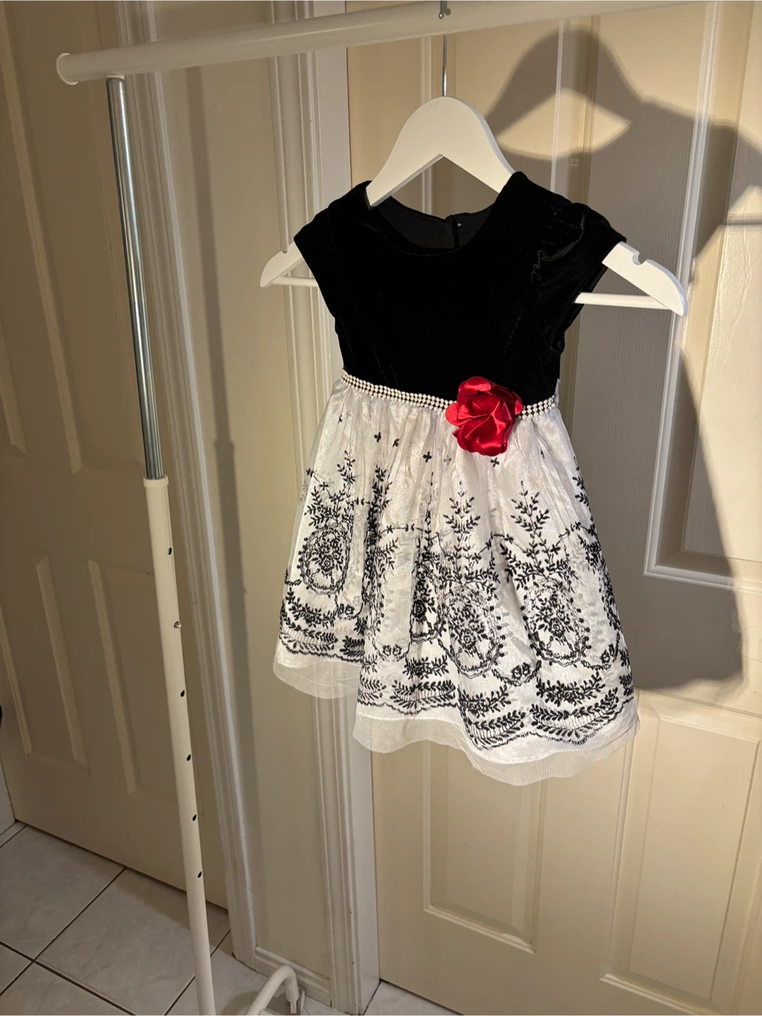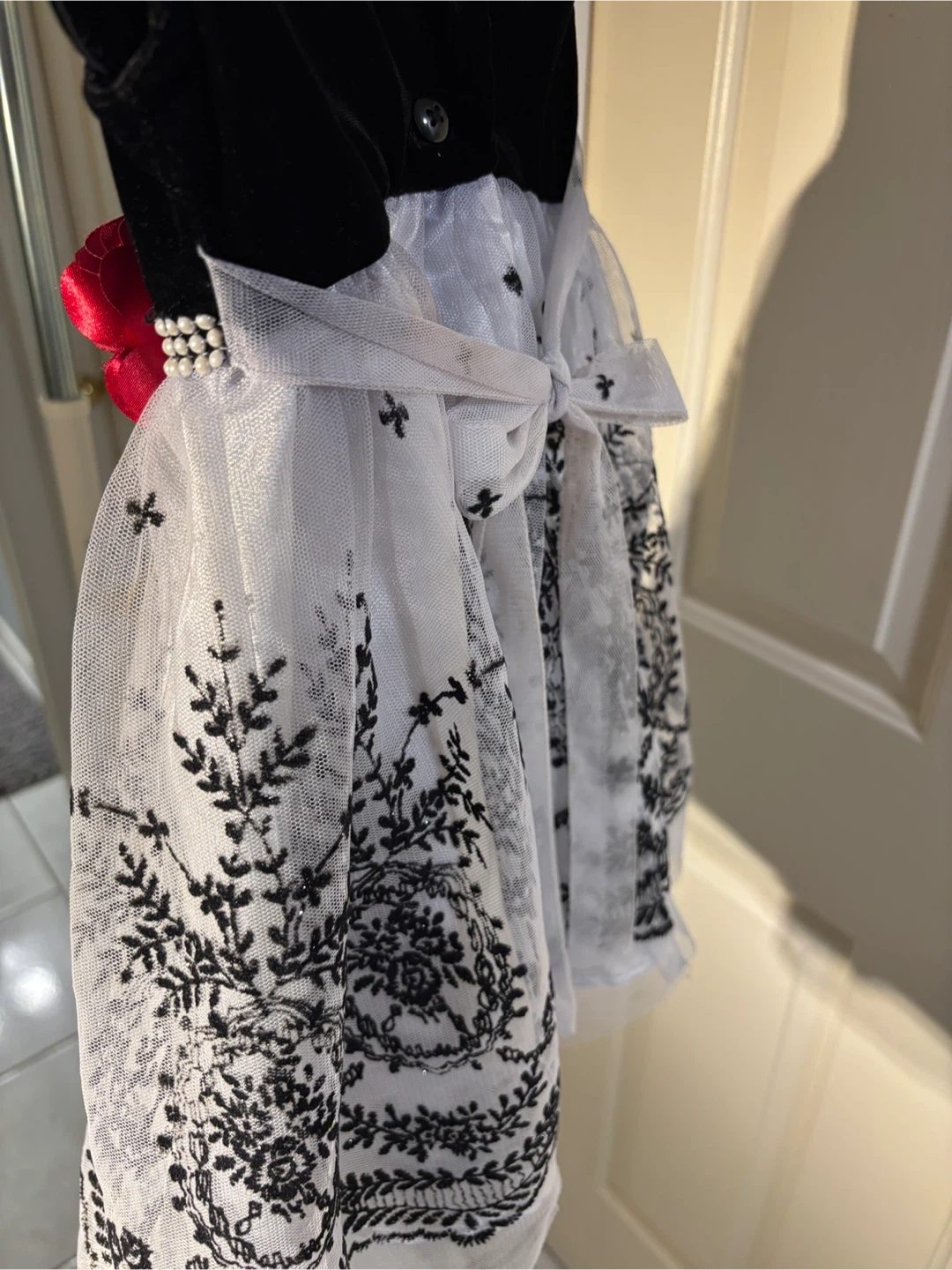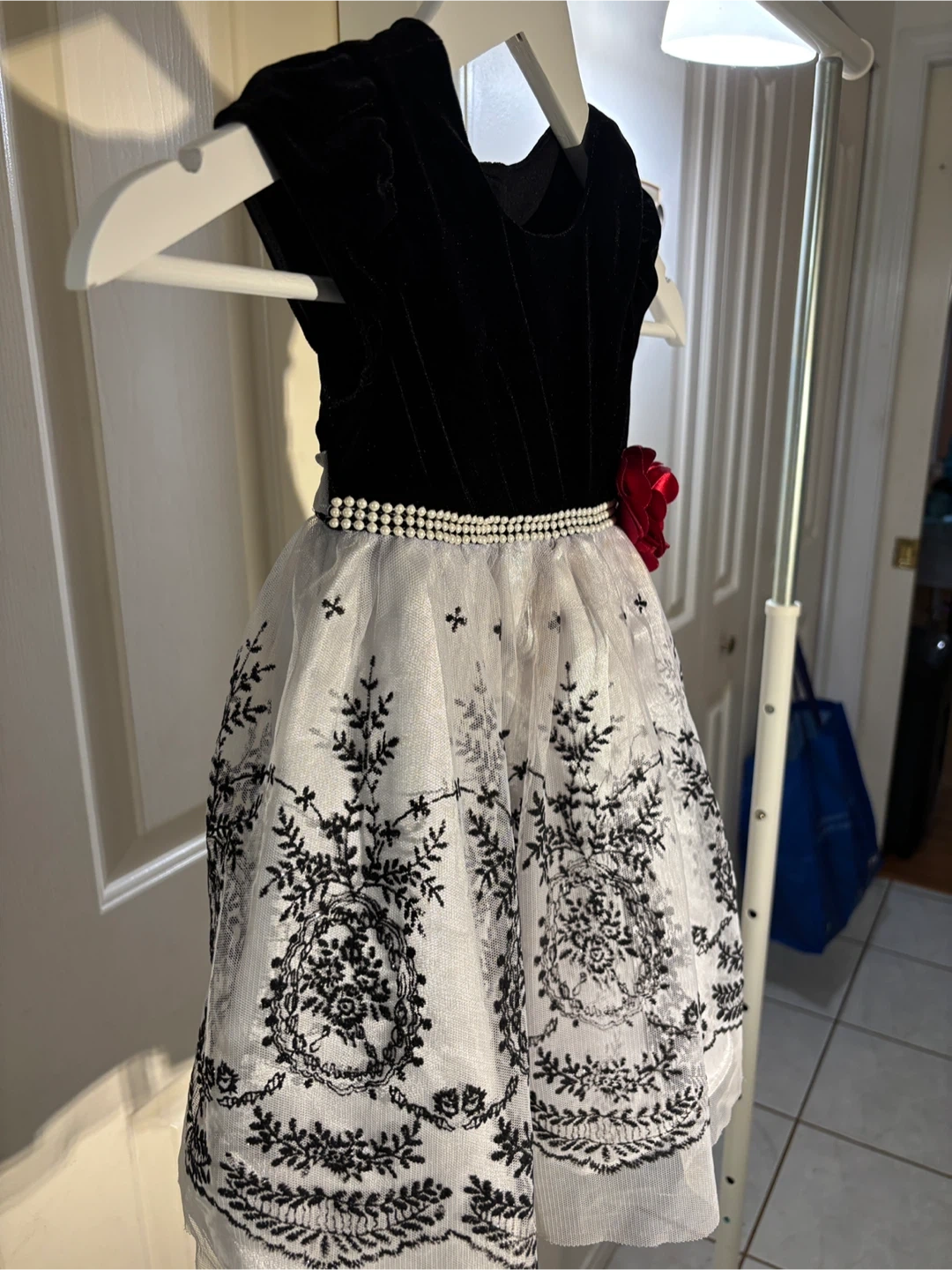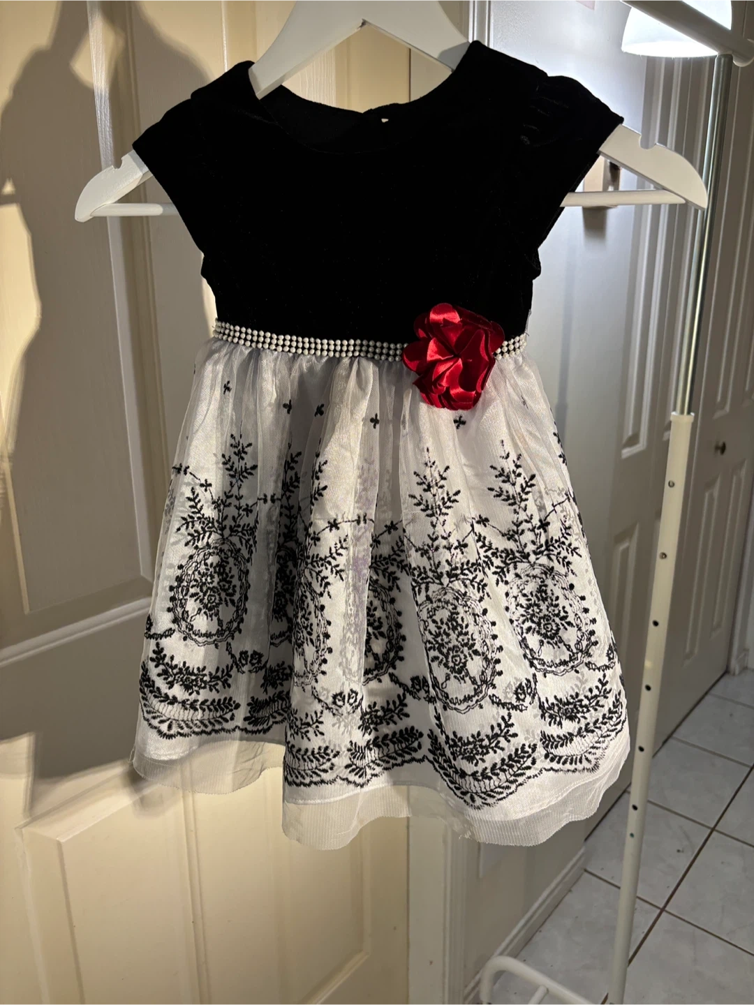 A beautiful elegant dress perfect for the holidays, weddings, or special occasions 🌟This lovely piece features a soft black velvet bodice, a pearl-accented waistband adorned with a cranberry coloured flower 🌹