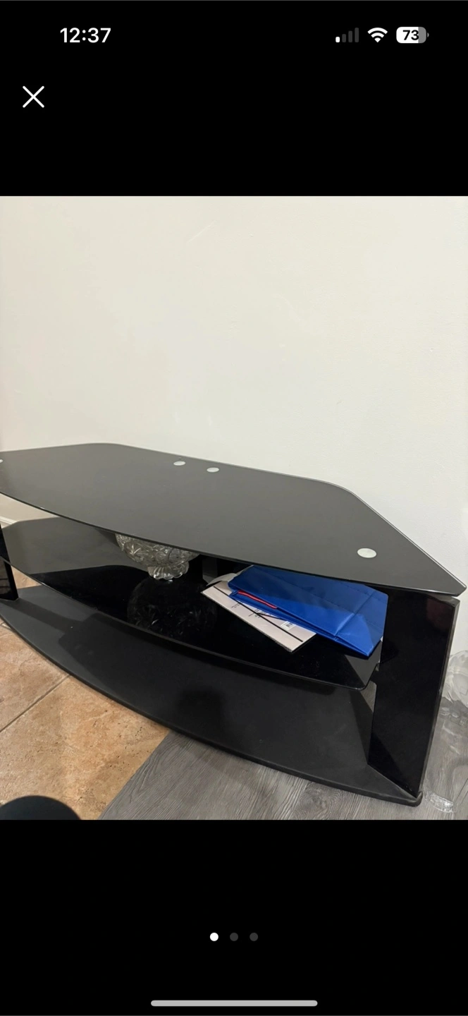 Curved black glass top. Two shelves for storage. Modern design. Great for smaller spaces.