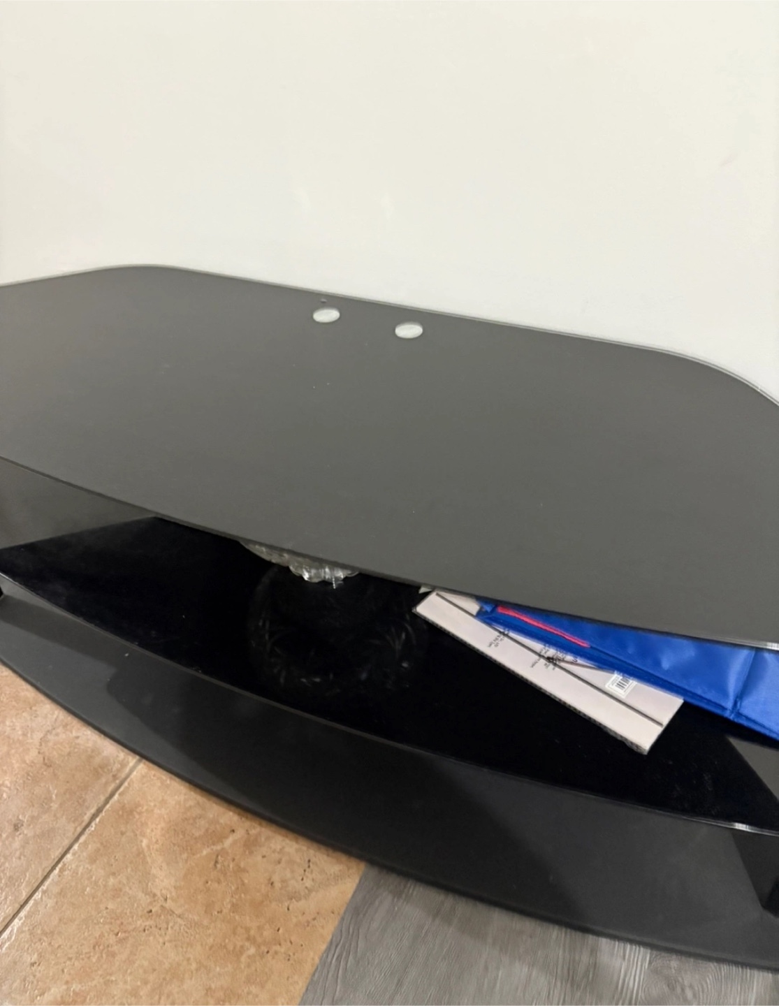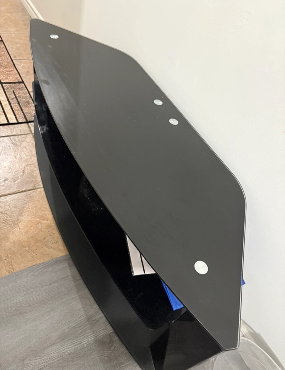 Curved black glass top. Two shelves for storage. Modern design. Great for smaller spaces.