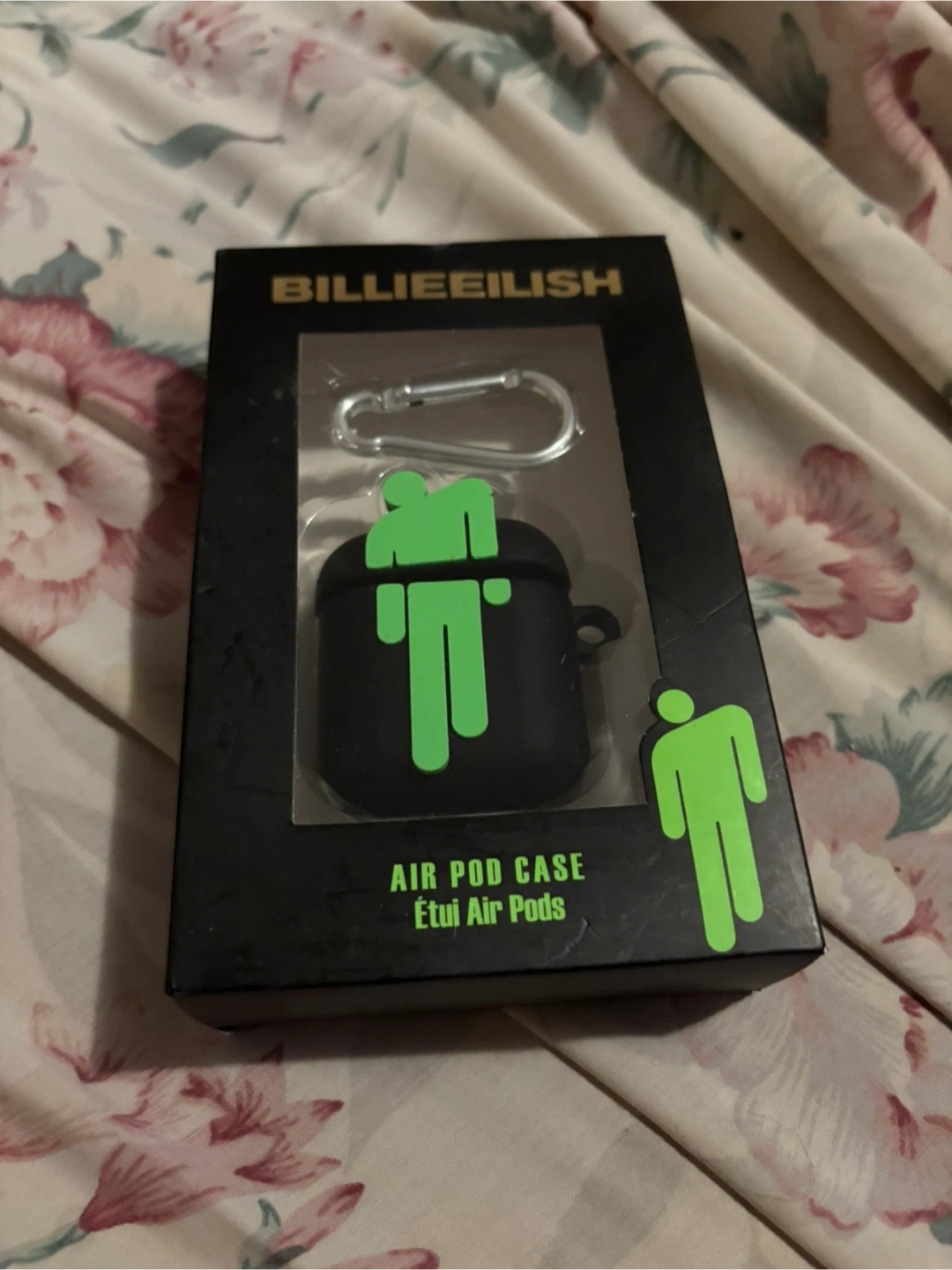This black silicone Air Pod case features a neon green Billie Eilish graphic. It comes with a silver carabiner for easy attachment. Protects your Air Pods in style!