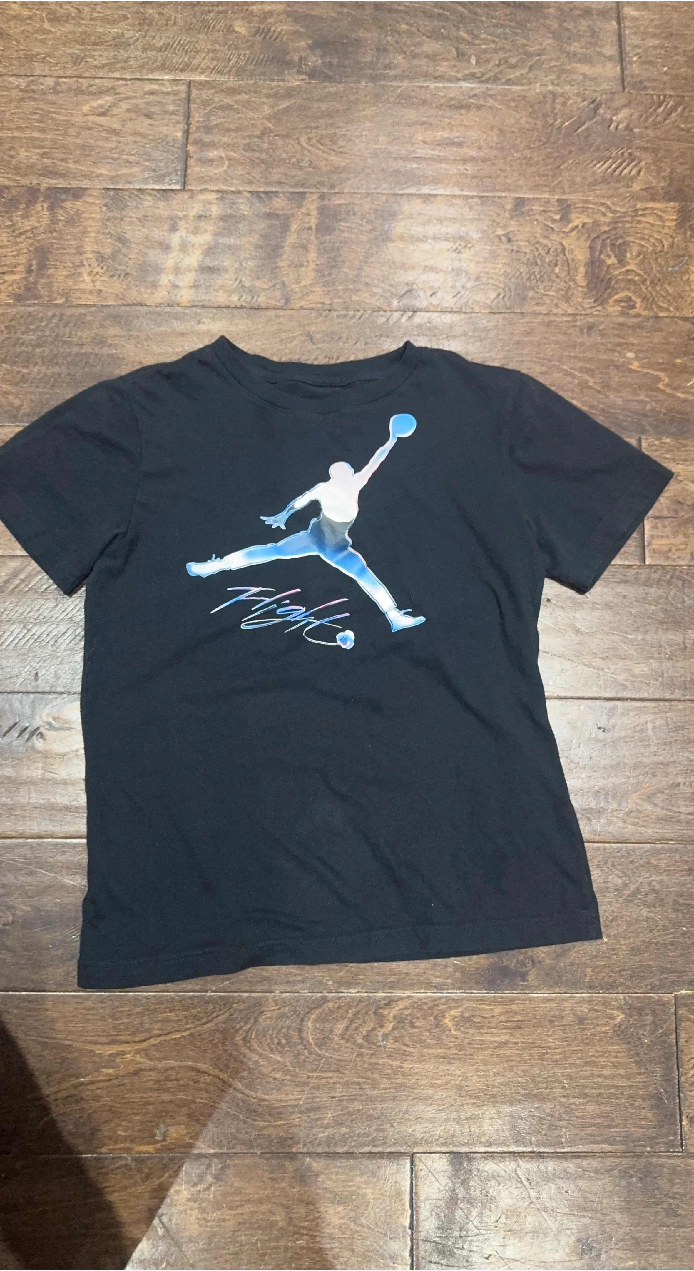This is a black t-shirt featuring the iconic Jordan Jumpman graphic with a gradient fill. It's made of comfortable material, perfect for everyday wear. This shirt is great for any basketball fan!