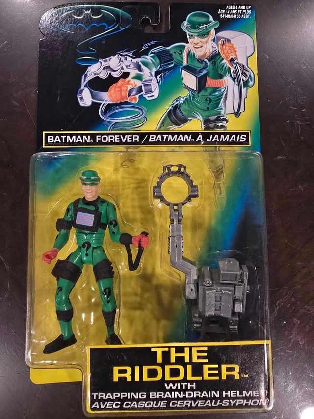 Offering a vintage 1995 Kenner Batman Forever The Riddler action figure, complete with Trapping Brain-Drain Helmet. This action figure is new in its original, unopened packaging. It's a fantastic piece for collectors or fans of the Batman series. Brand: Kenner, Character: The Riddler, Movie: Batman Forever, Year: 1995. If the listing is live, then this item is still available.