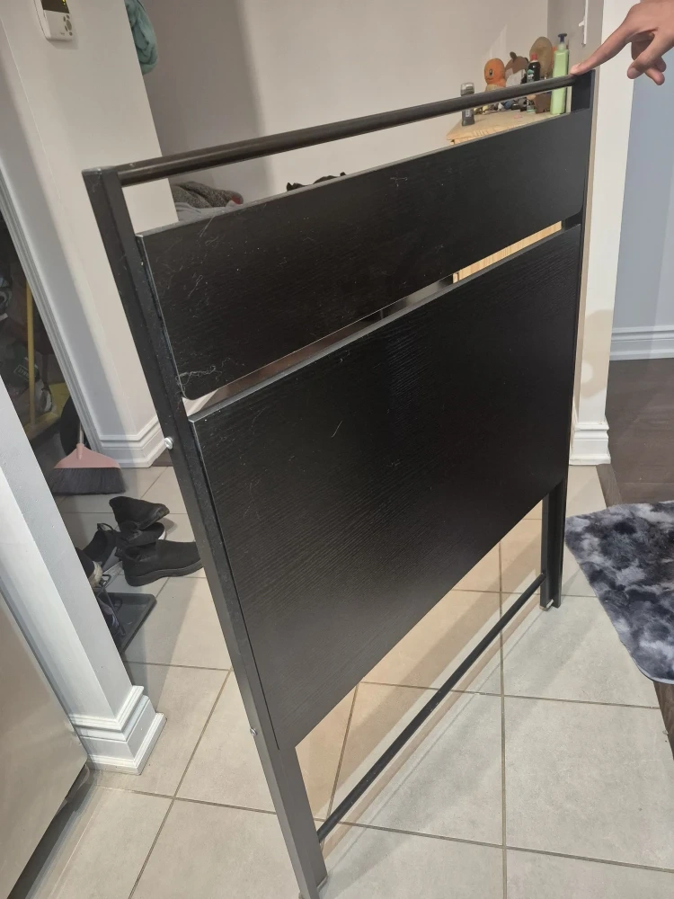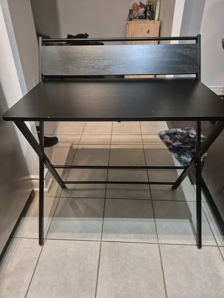 Selling a black folding desk It's in great condition and perfect for small spaces or anyone who needs a desk that can be easily stored away. It has a simple design with a black top and metal frame, making it a versatile addition to any room