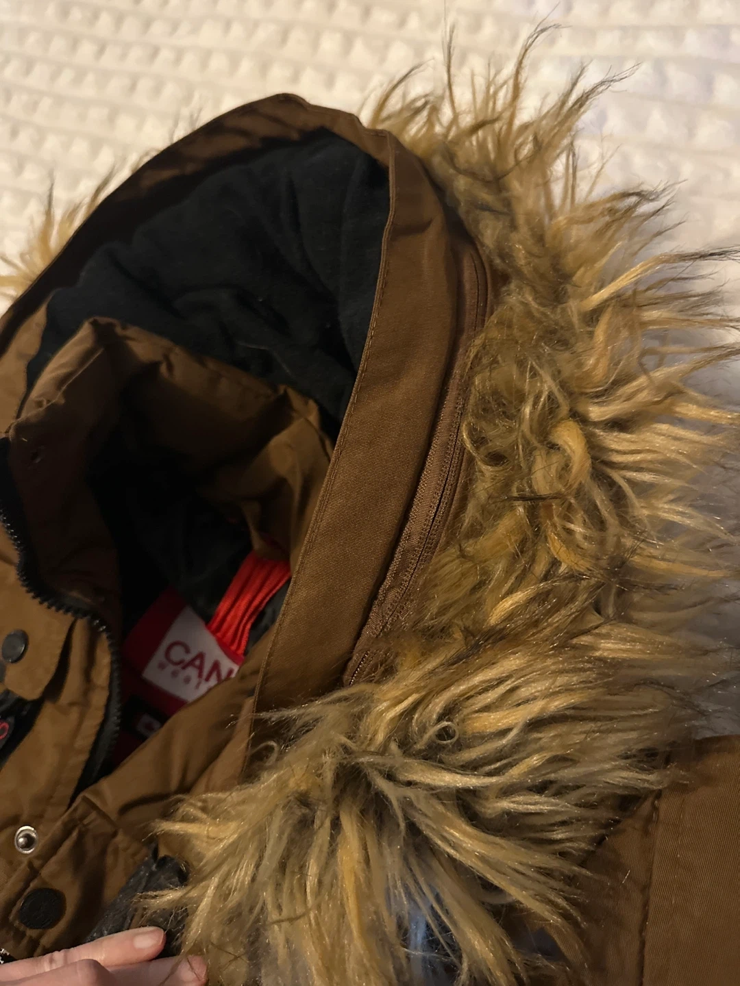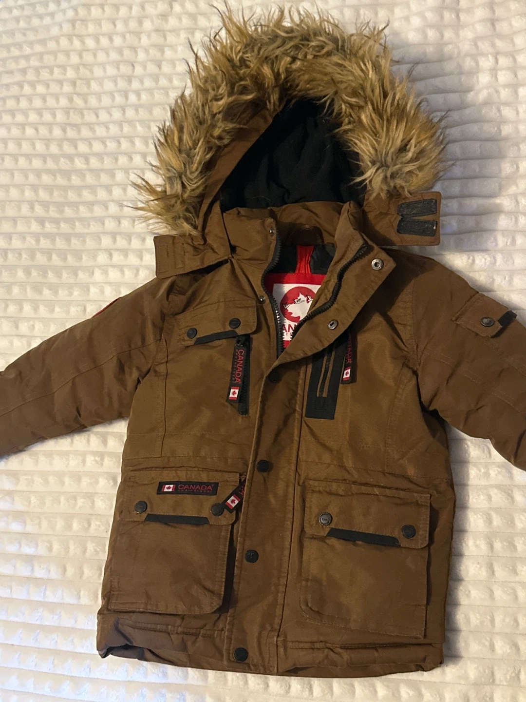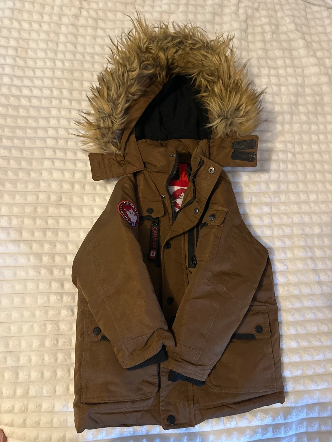 Boys Canada Weathergear insulated parka in a warm brown. Features a faux fur-trimmed hood and multiple pockets. Maintains warmth down to -20°C for moderate activity. Size 5/6.
