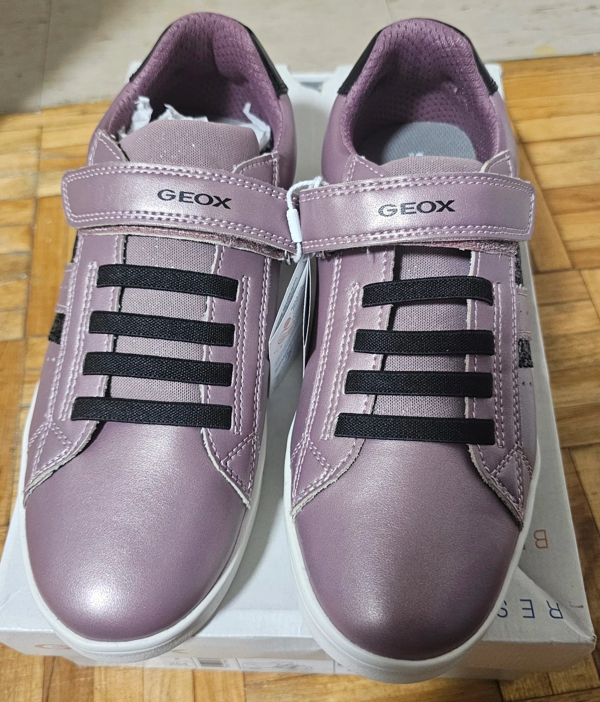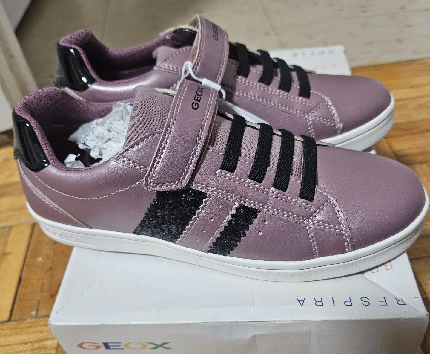 Beautiful GEOX sneakers with metallic purple color and black glitter accents. Stylish, comfortable, and perfect for everyday use.