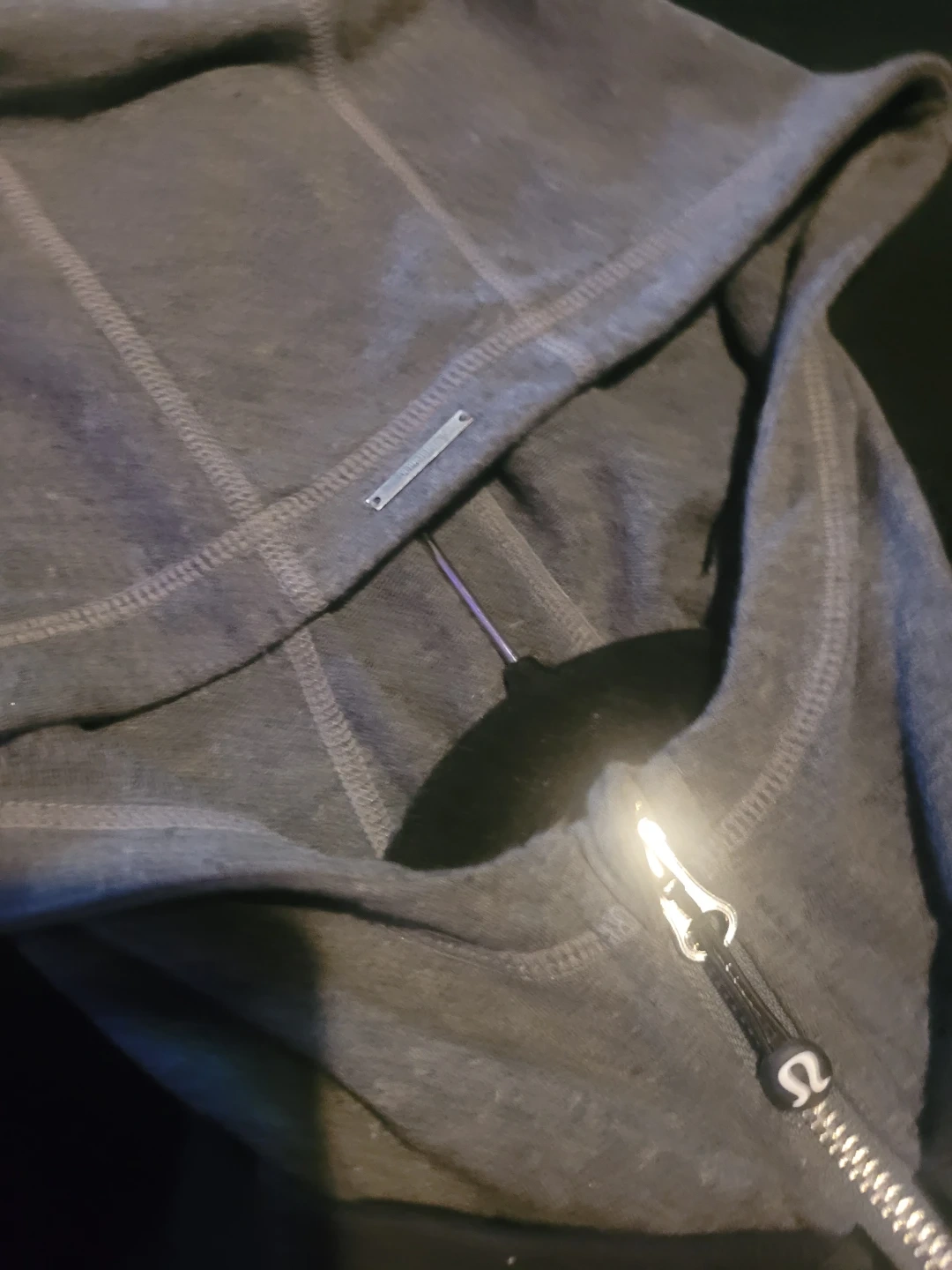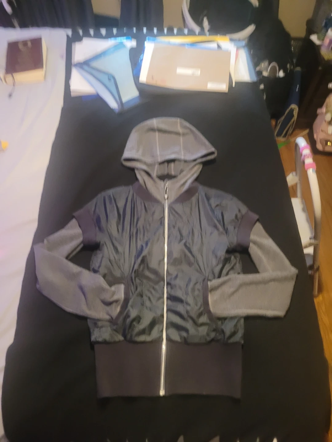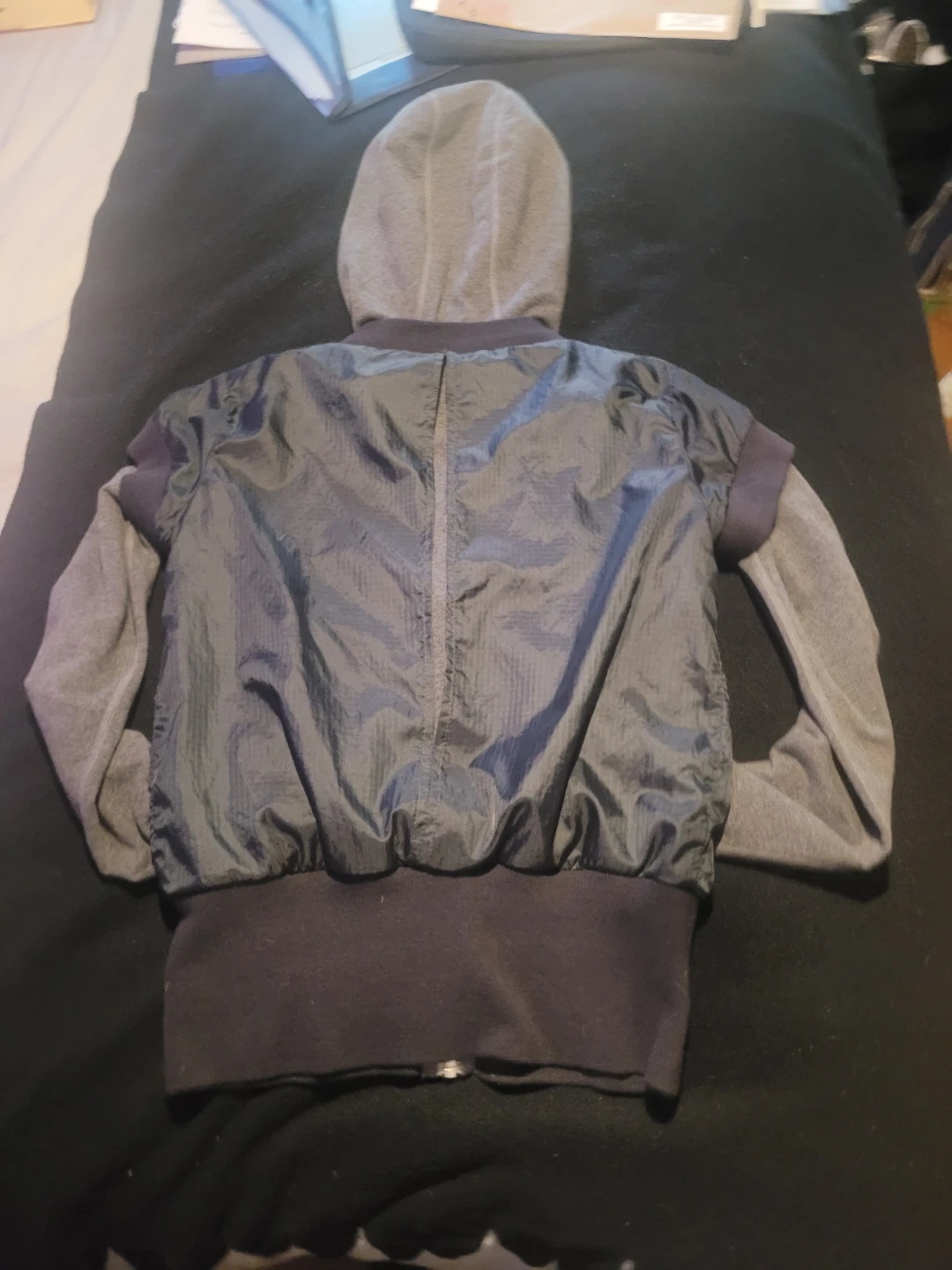 This Lululemon hoodie bomber jacket is grey and features a full zip closure. It has a nylon shell with jersey sleeves and hood. It's suitable for casual wear.