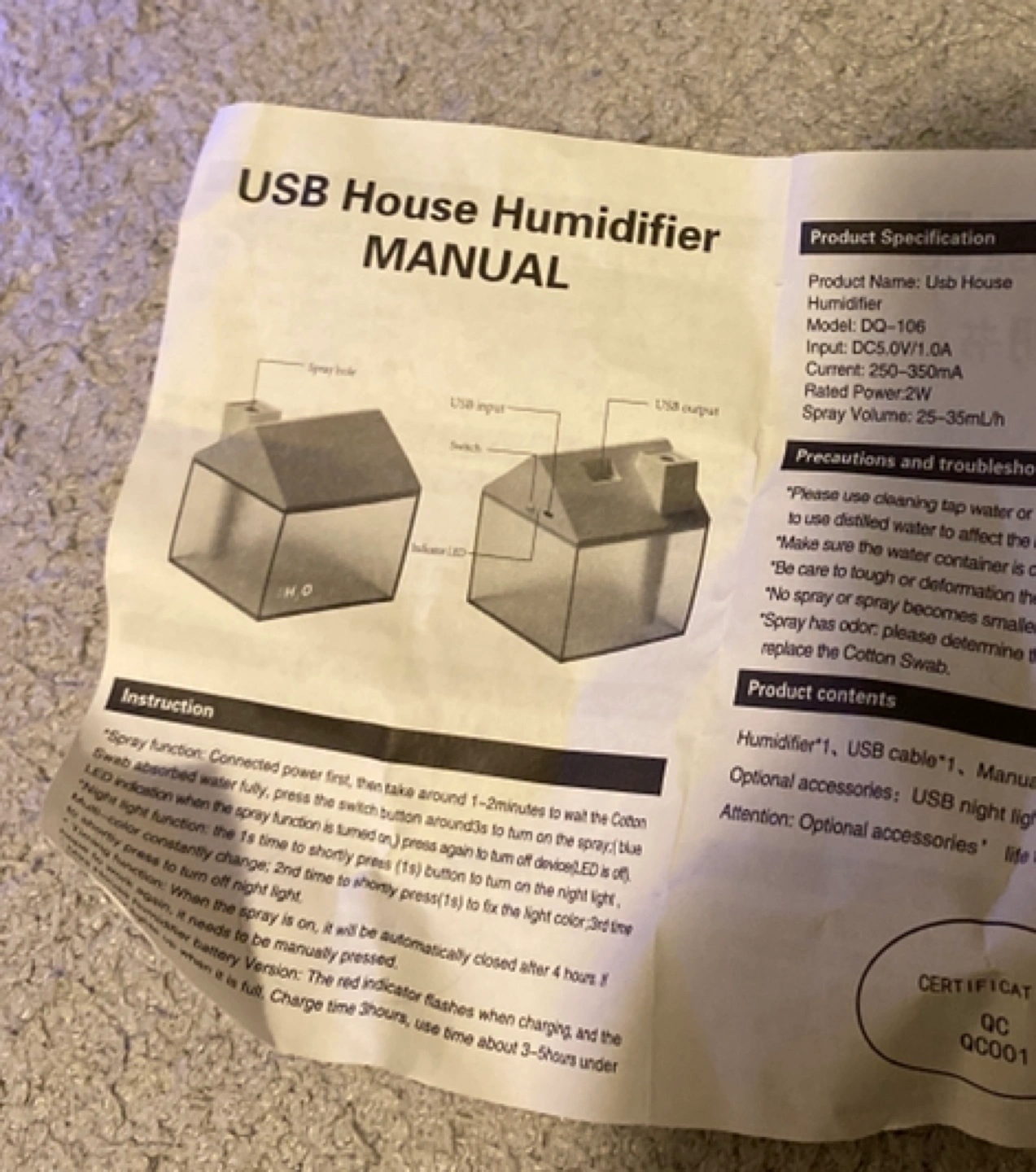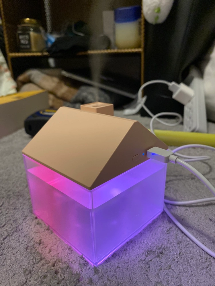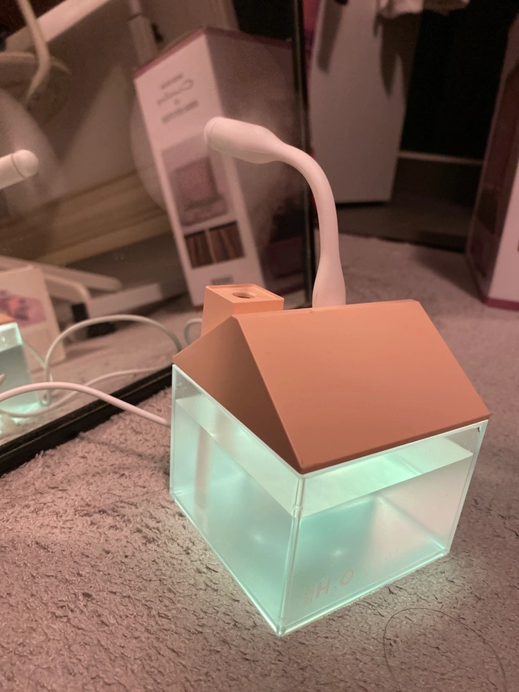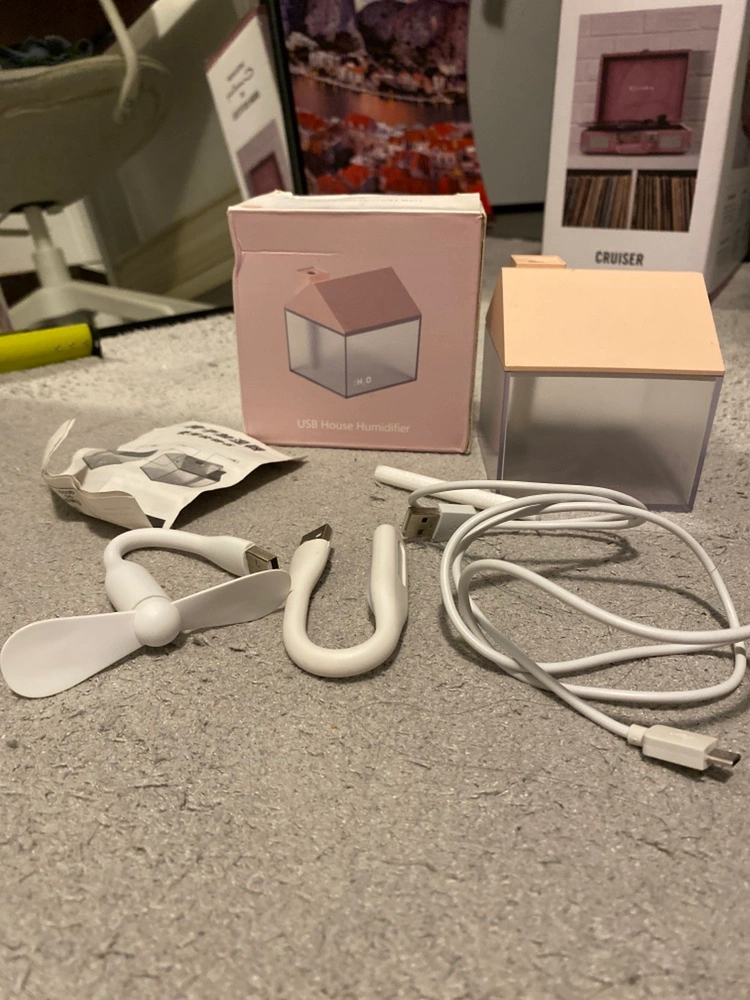 This is a small pink house-shaped humidifier that lights up (changes colour). It comes with a USB cable, a USB fan, and USB light accessory that can be attached to the humidifier (see second picture). Comes with box, manual, and extra filter. Works great and super cute for your desk :)