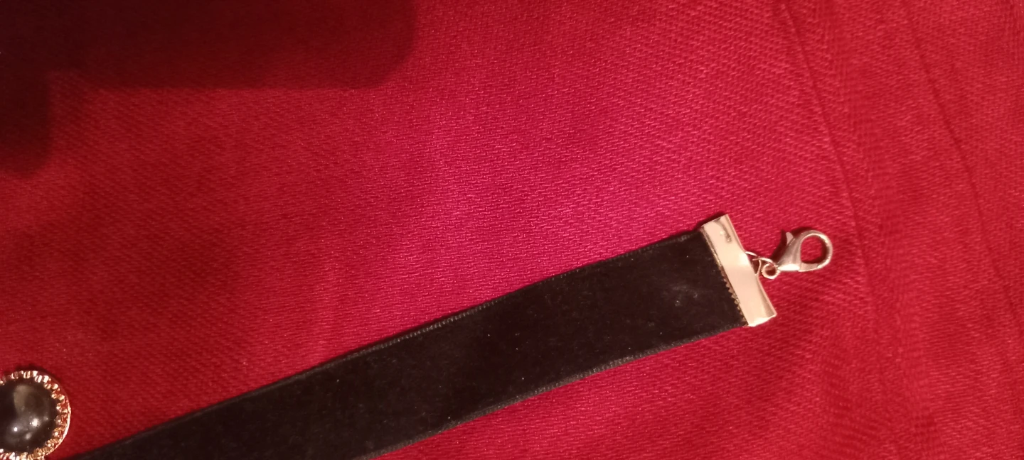 A black velvet choker necklace featuring a decorative pendant with a dark, faceted stone. It has an adjustable chain for a comfortable fit. This necklace adds a touch of gothic or vintage style to any outfit.