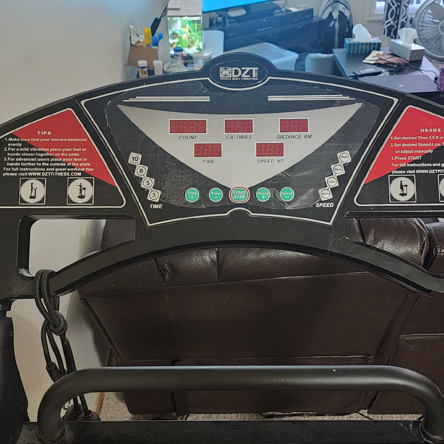 Selling a DZT whole body vibration machine. It displays count, calories, distance in kilometers, time, and speed. Excellent used condition.