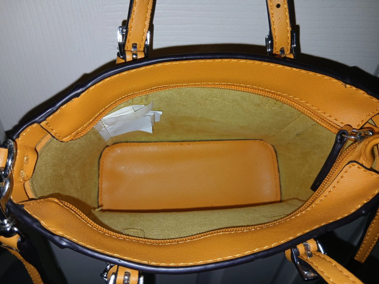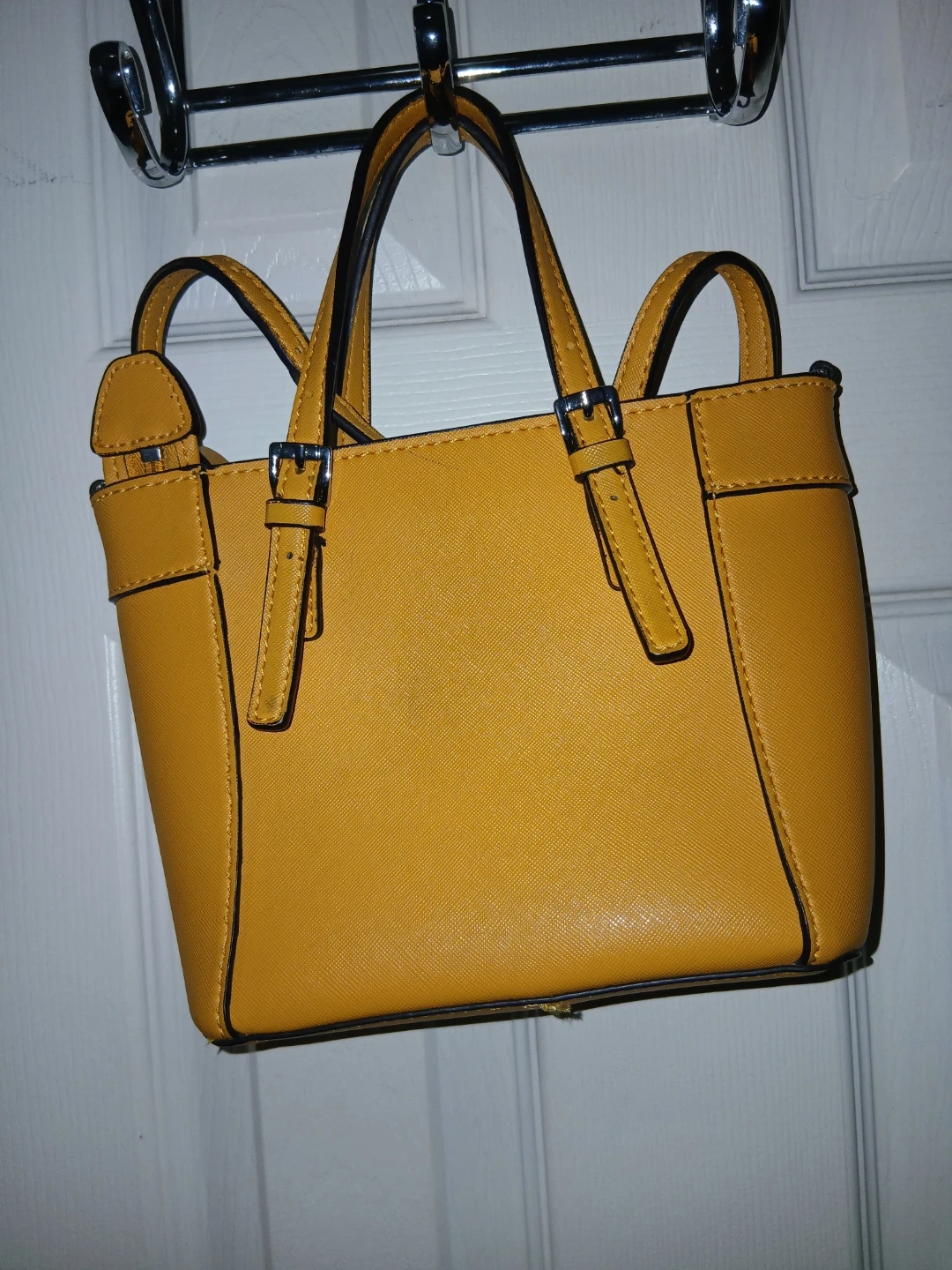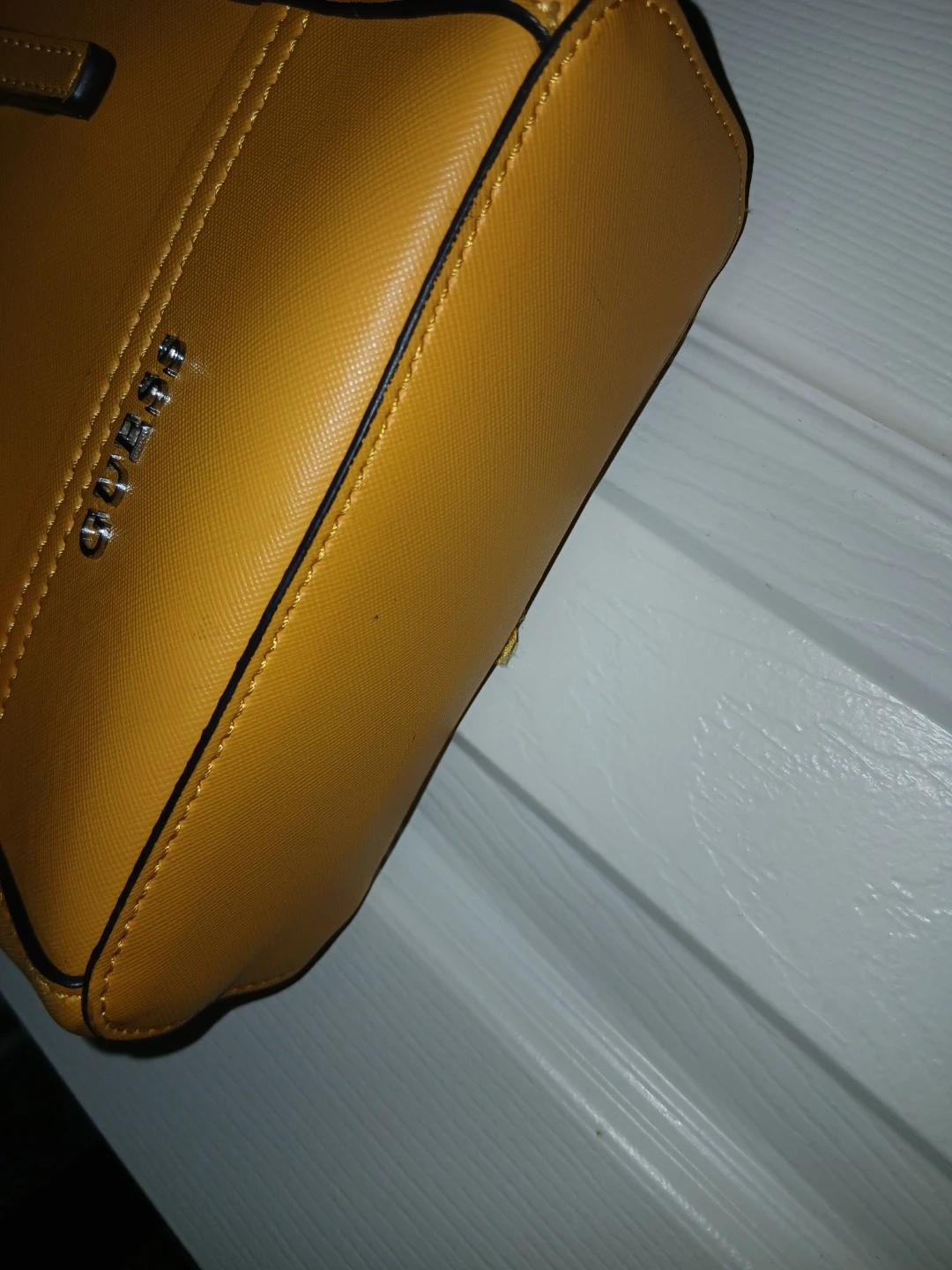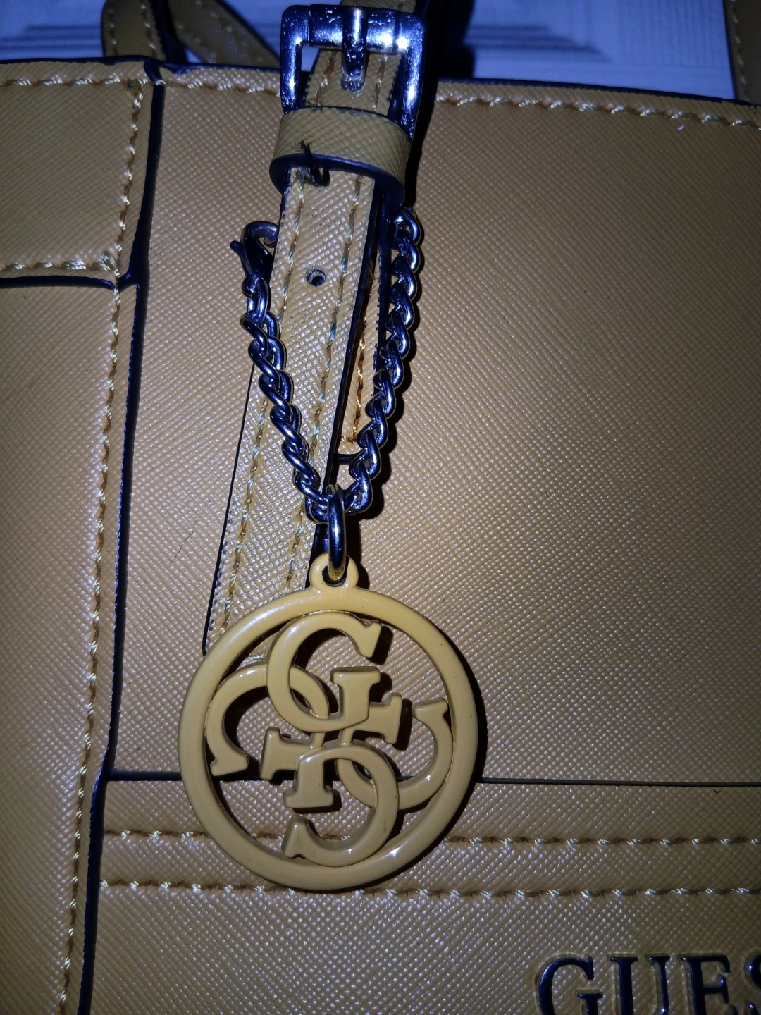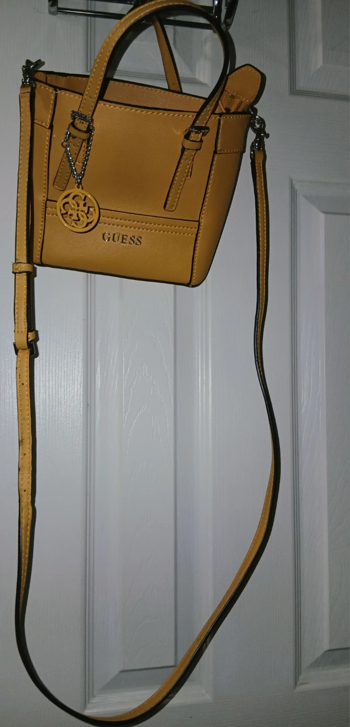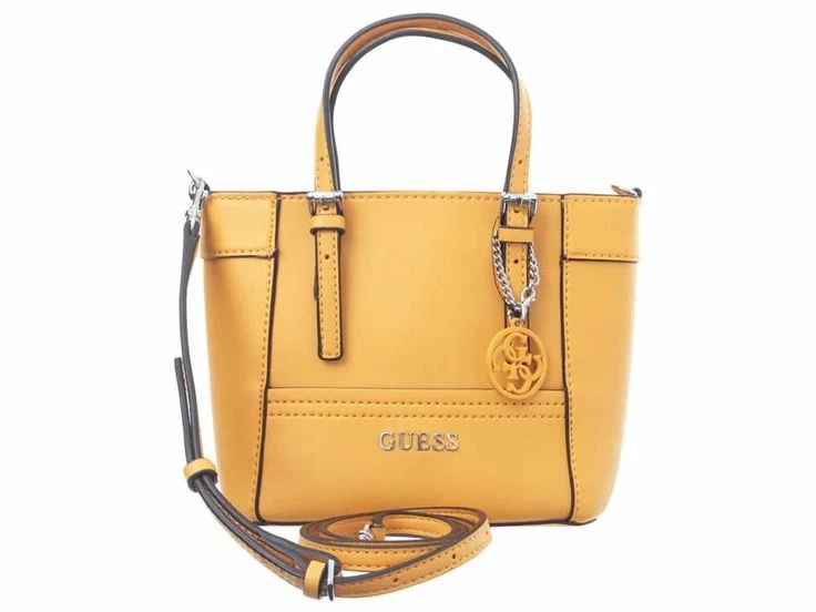 This is a yellow mini tote bag by Guess. It has top handles and an adjustable crossbody strap. The interior is lined with a zippered compartment.