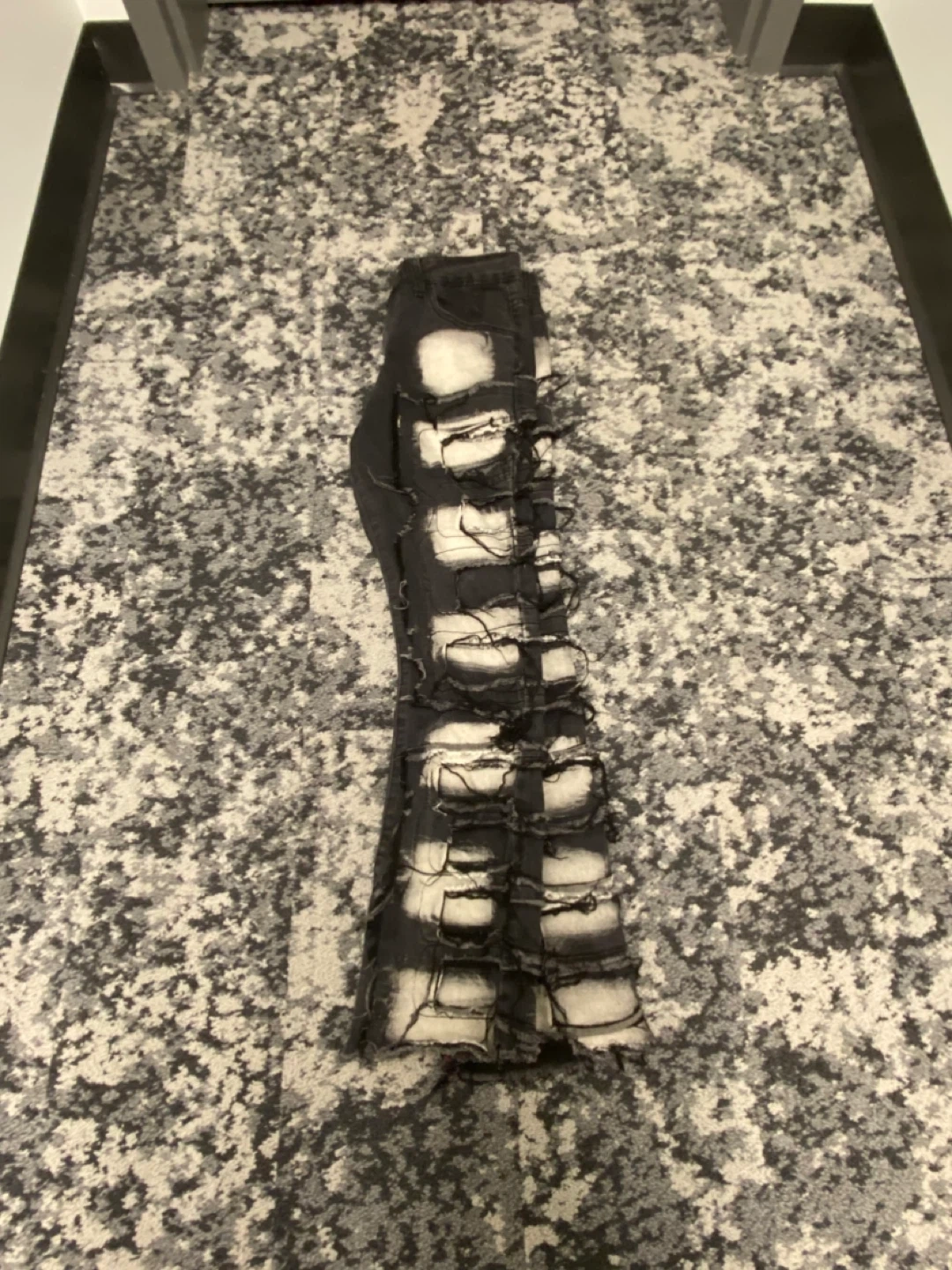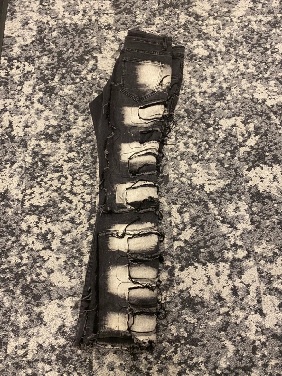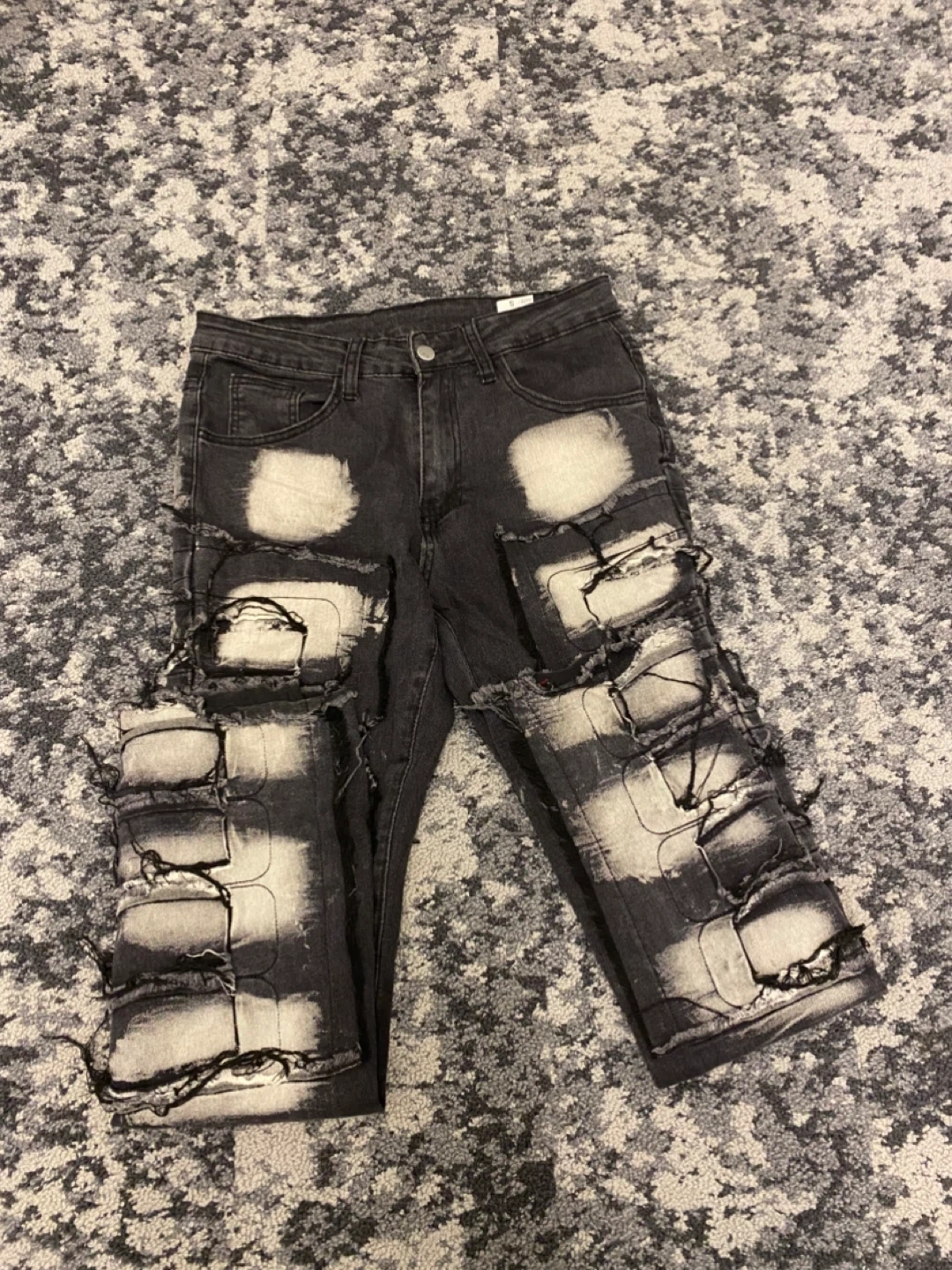 Selling a pair of distressed black jeans. They have a unique design with multiple rips and white fading throughout. Great for a bold and edgy look!