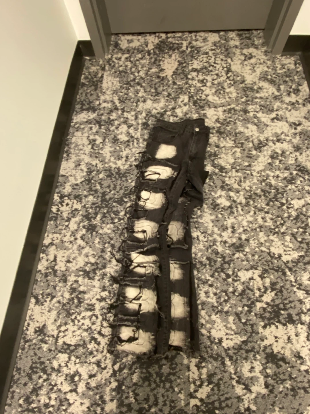 Selling a pair of distressed black jeans. They have a unique design with multiple rips and white fading throughout. Great for a bold and edgy look!