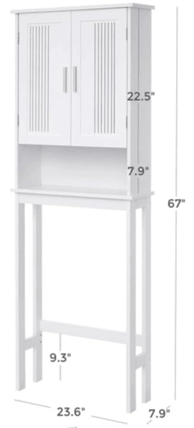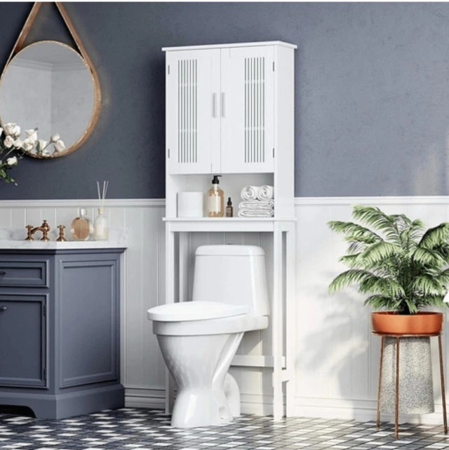 Elevate your bathroom's organization with this new white over-the-toilet storage unit, featuring an adjustable shelf. Maximize space and add a touch of elegance to your bathroom decor with this functional piece. This over-the-toilet storage unit offers a blend of style and practicality. Product specifications: Adjustable Shelf, Colour: White. Dimensions: Please refer to the images provided. If the ad is up, the item is available. Cash accepted.