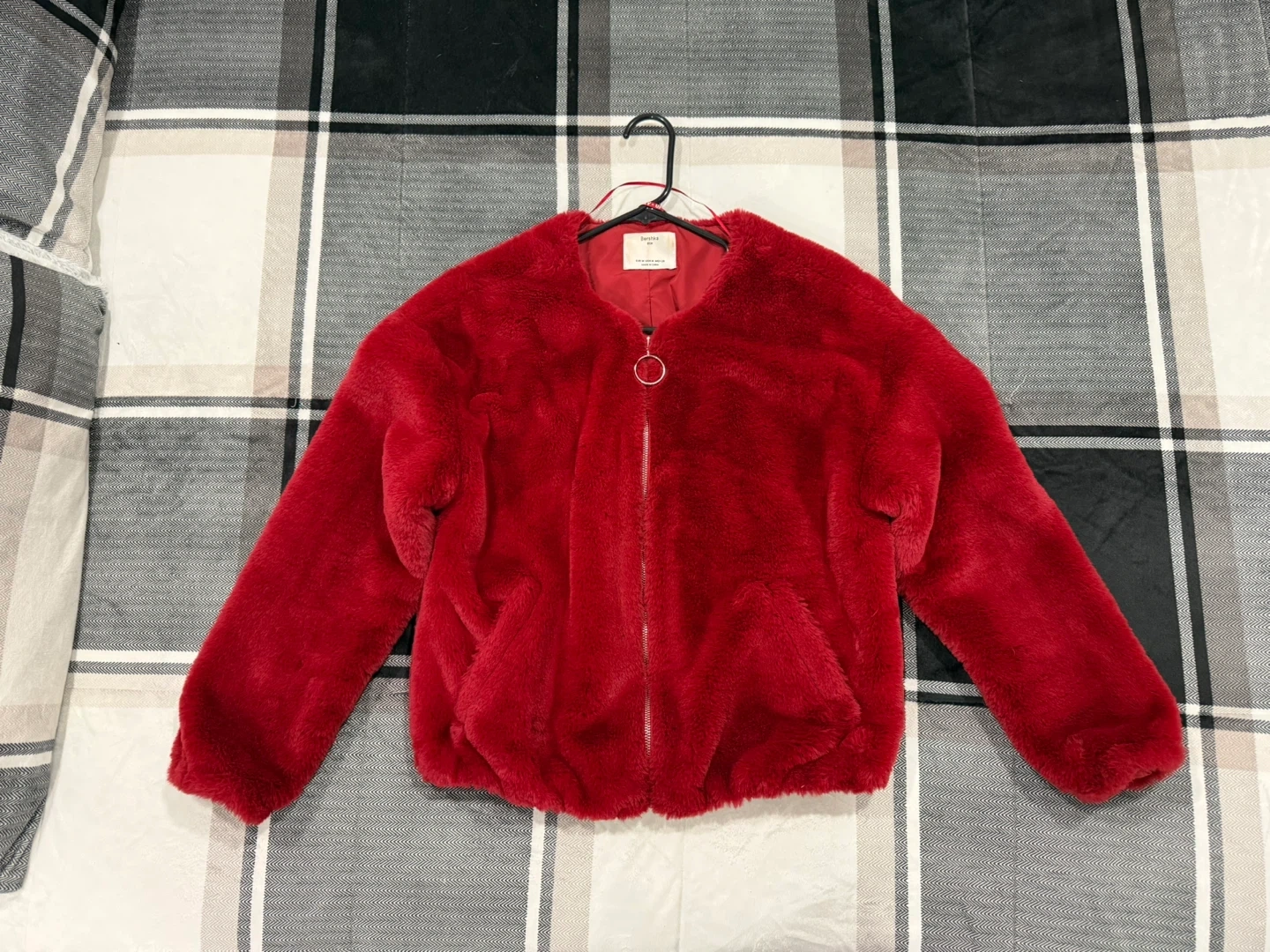 Red faux fur bomber jacket by Bershka. It's a fun, cozy layer for your wardrobe. Zip-up front with pockets.