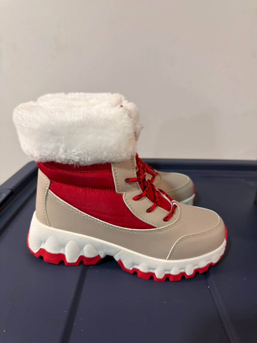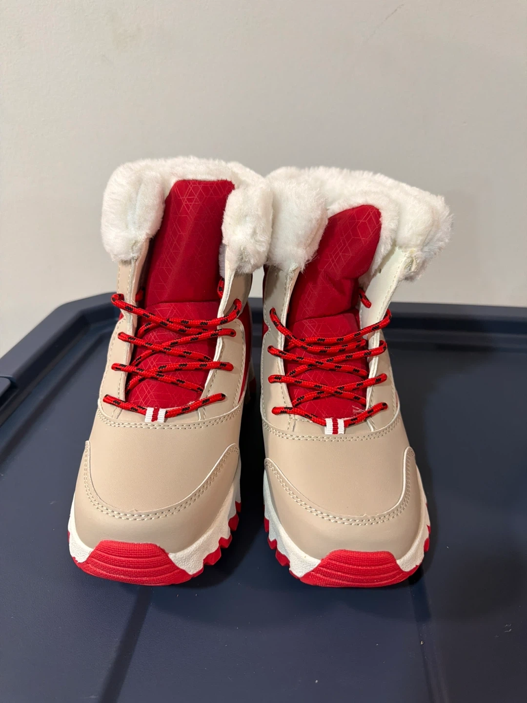 These winter boots are in great condition and ready for the snow! They feature a beige and red color scheme with white faux fur trim. Perfect for keeping your feet warm and stylish during the colder months
