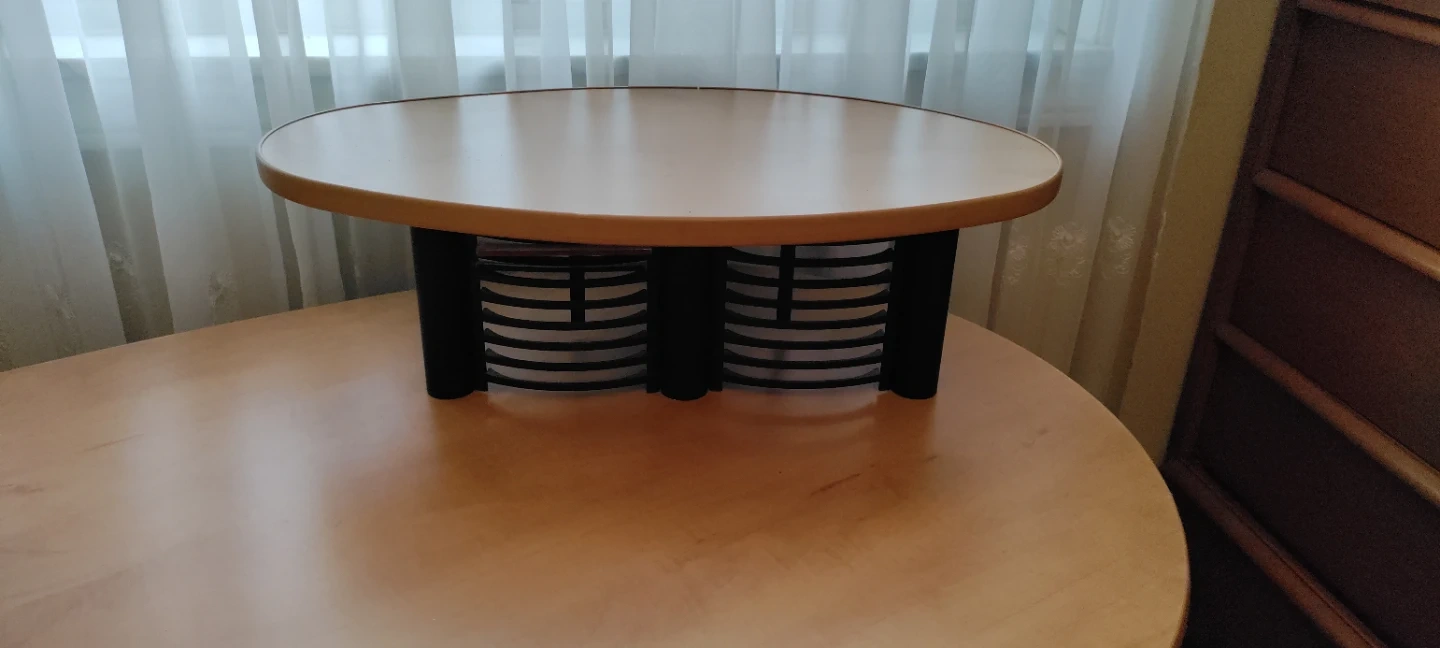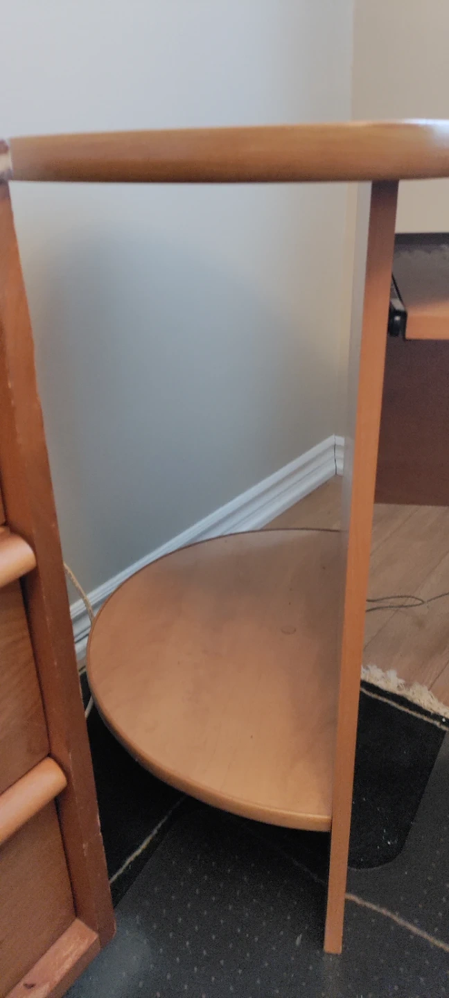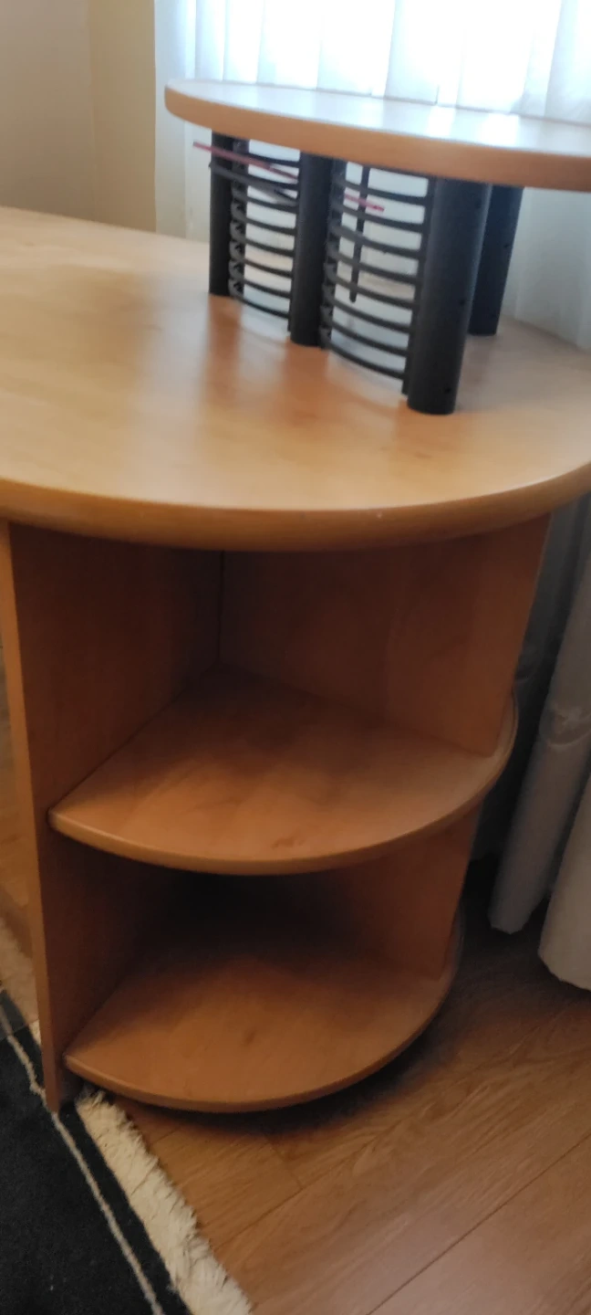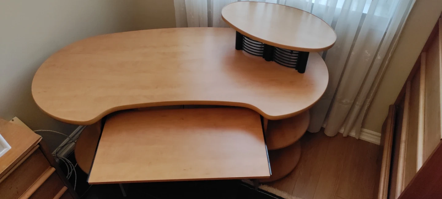 This Pod-shaped wood desk offers ample workspace and features a unique tiered monitor stand with black ribbed supports. It includes a pull-out keyboard tray and built-in shelving units on the side.