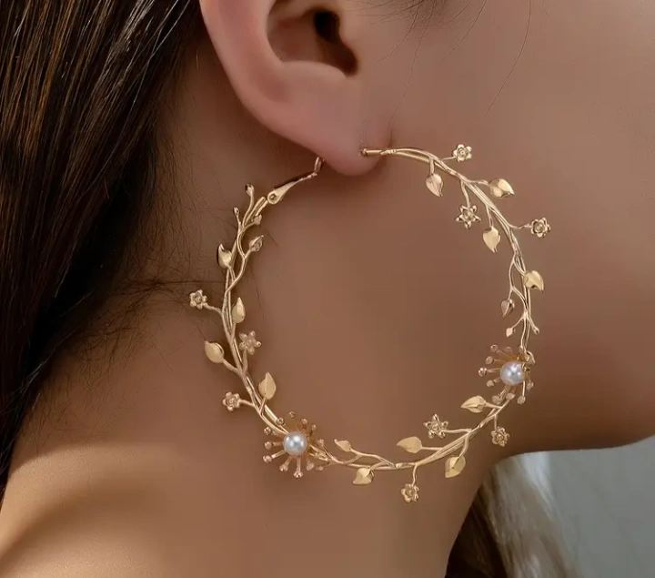 These are a pair of gold hoop earrings with a floral design. They feature leaves and small flowers, with pearl-like accents in the centre of some of the flowers. Perfect for adding a touch of nature-inspired elegance to your look!