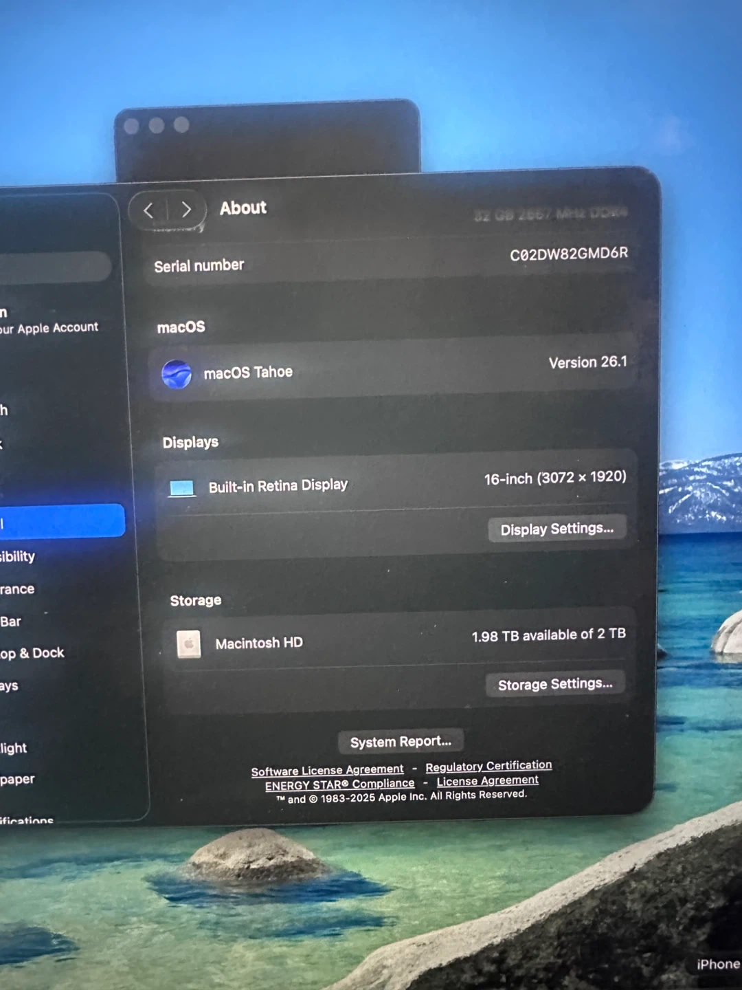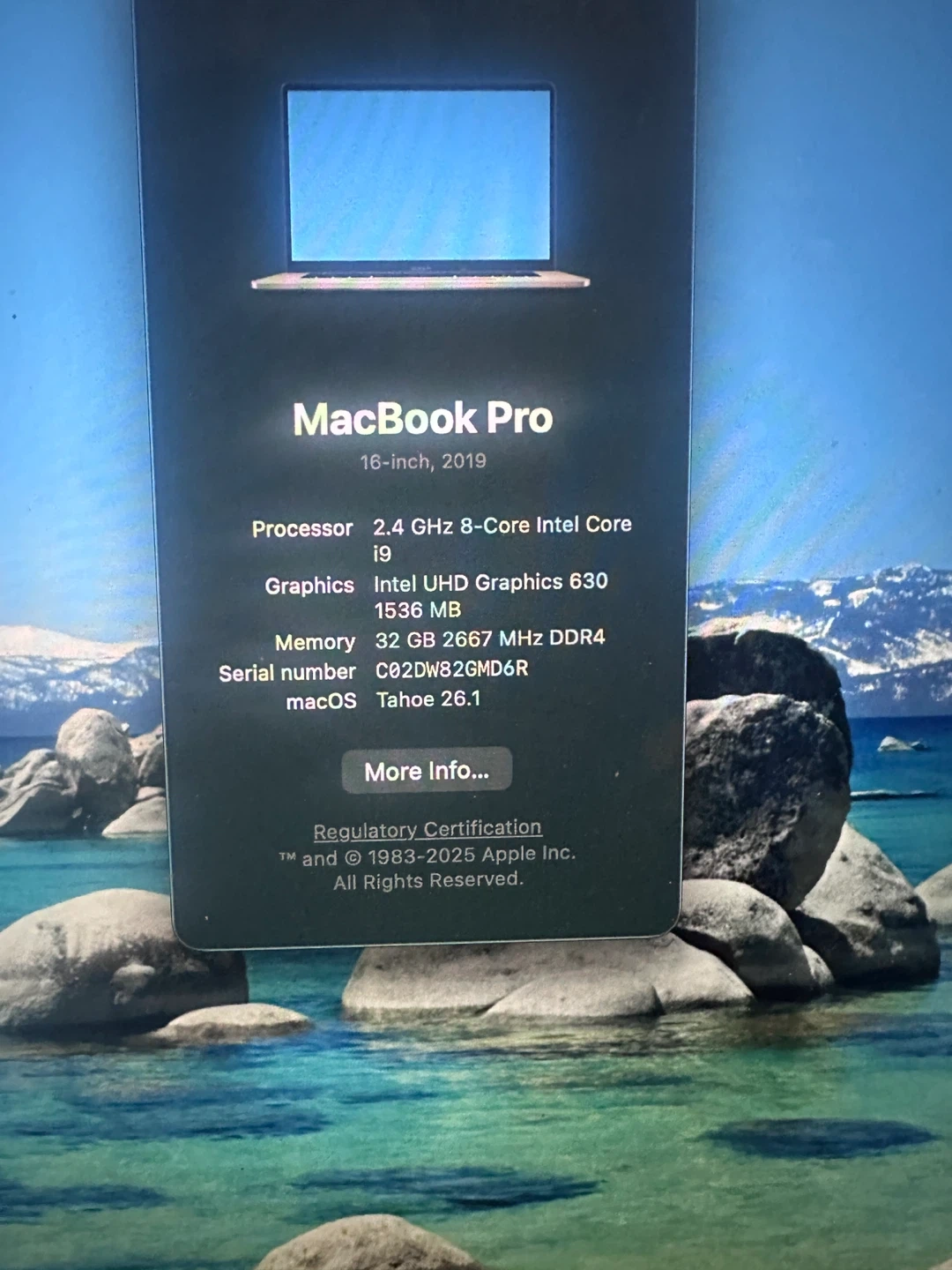 This 2019 16-inch MacBook Pro features a 2.4 GHz 8-Core Intel Core i9 processor and 32 GB memory. It has a Built-In Retina Display with 3072 x 1920 resolution and 1.98 TB of storage. Runs macOS Tahoe version 26.1.