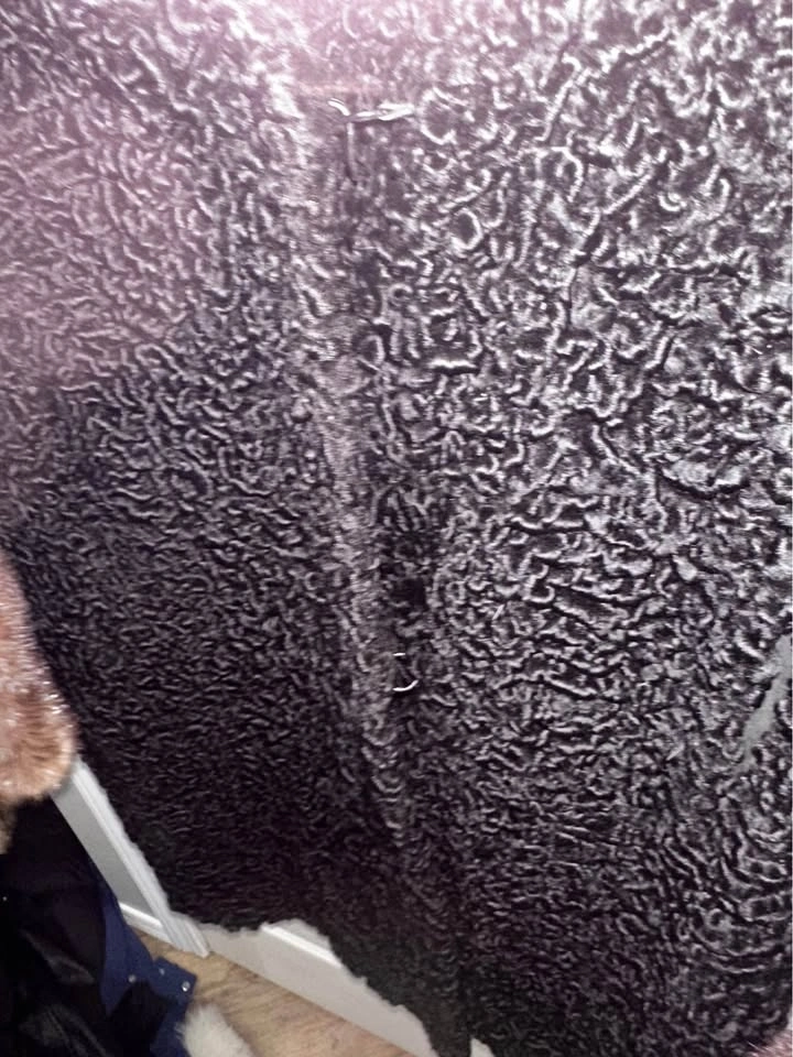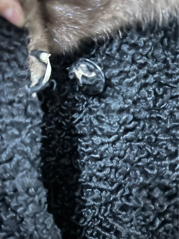 Elegant vintage genuine Persian lamb Ted Sisson black coat with a curly textured fabric and mink fur trim on the collar and cuffs. The lining is silky satin. Overall excellent vintage condition, only minor flaw is the top button has lost some fur and its elastic hook closure is brittle, priced accordingly. Fits like a medium. Pickup SW / Terwillegar / meet on campus most weekdays. Check my other listings, bundle for deals!