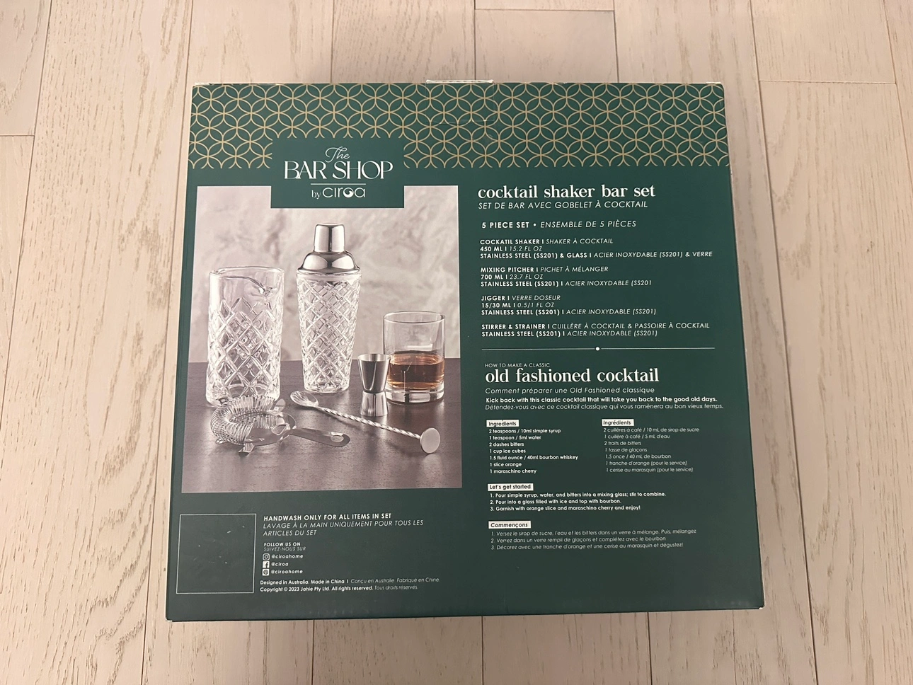 Cocktail shaker, jigger, stirrer, strainer, mixing pitcher