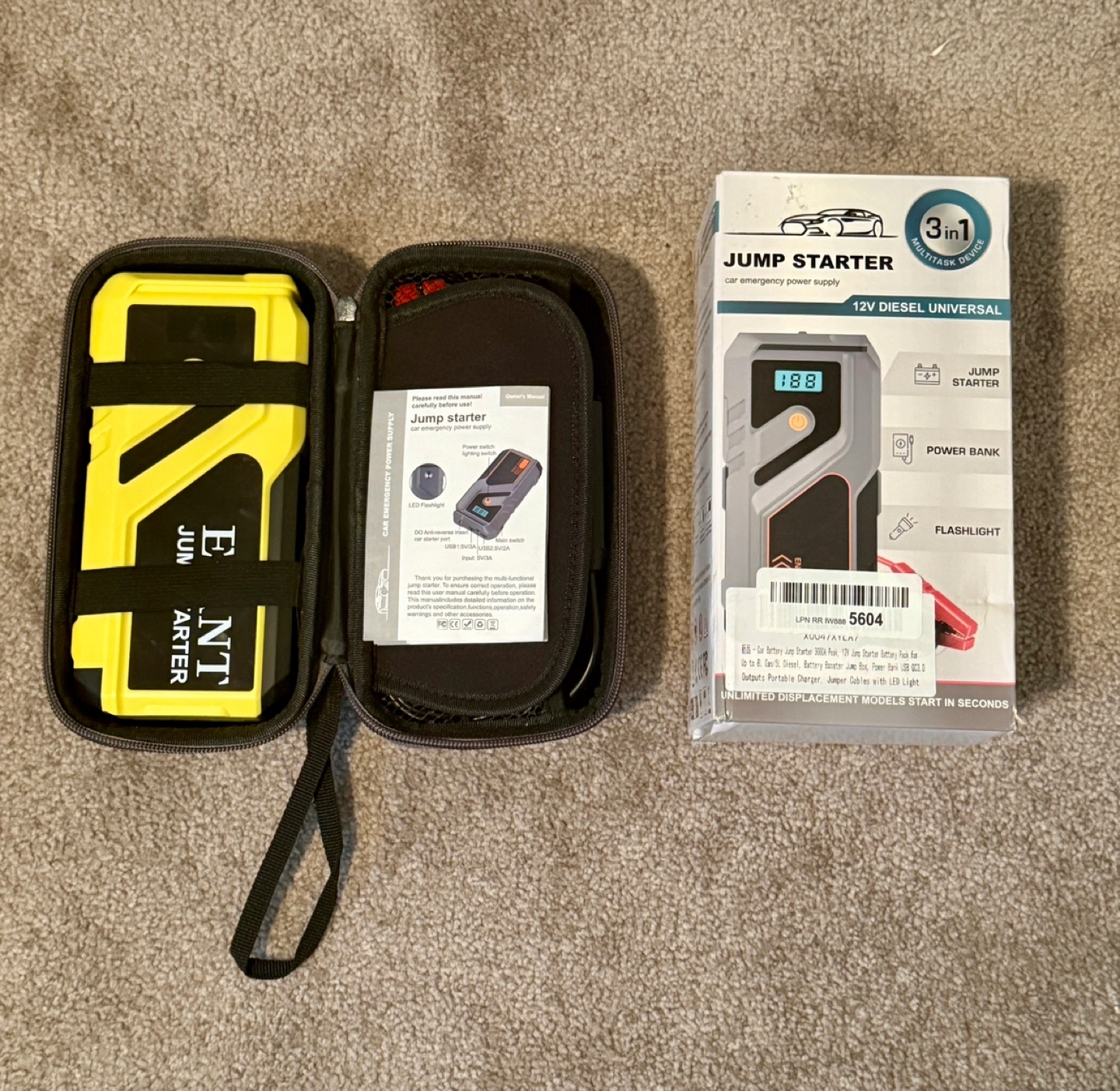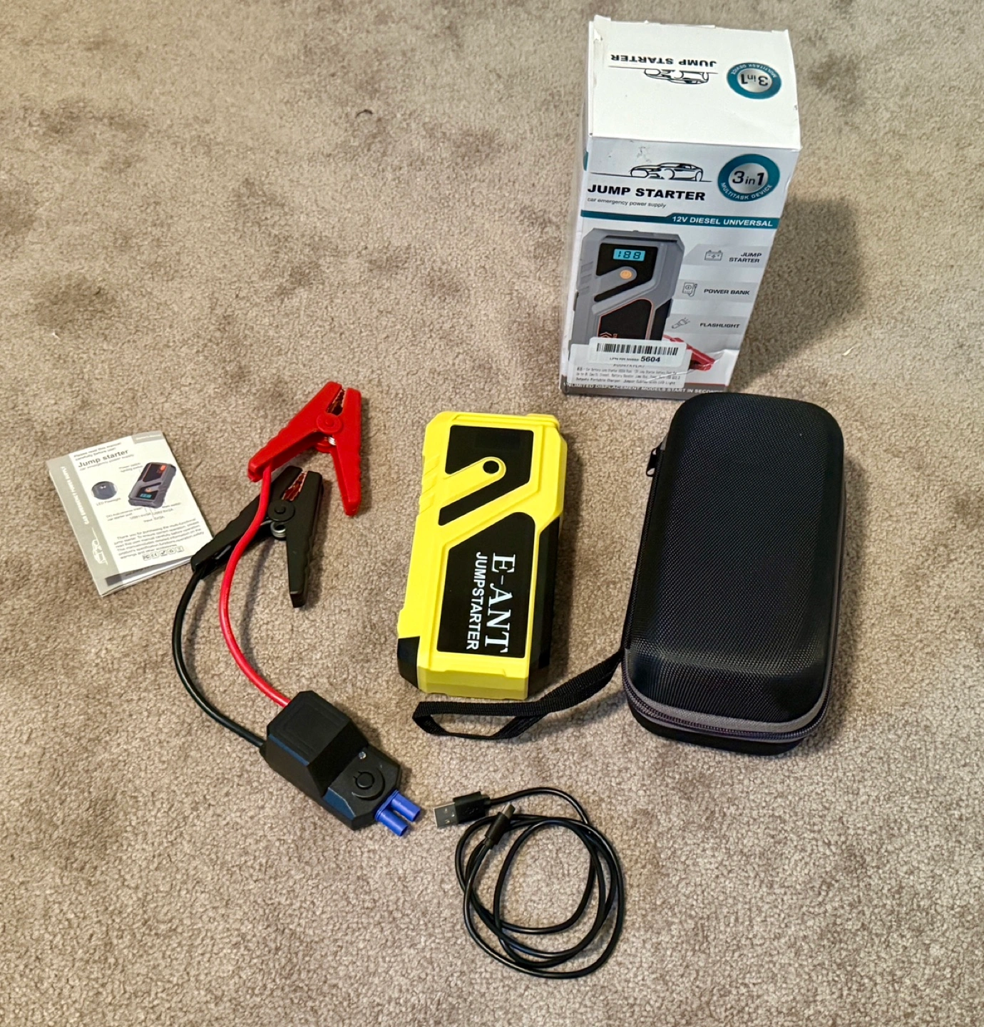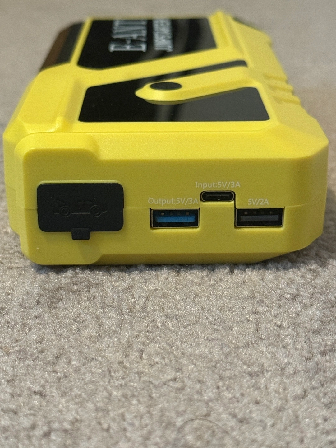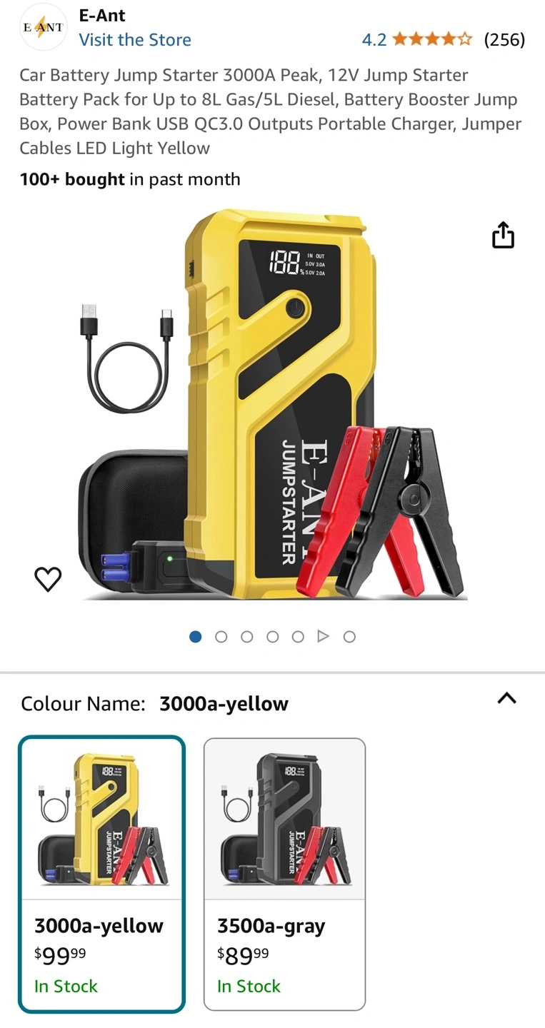 Car battery jump starter, 3000A peak, 12V jump starter, battery pack for up to 8L gas/5L diesel, battery booster jump box, power bank USB QC3.0 outputs, portable charger, jumper cables LED light yellow Haven’t used it in a long time. The battery may needs to be recalibrated. Ports and flashlight are currently not working but jumper cables still light up when connected… Have everything that came with it with its original packing and wires Goes for a $100 on Amazon so if you can get this fixed it would be great or can be used for part. FIRM on the price Could be a small issue which can be solved by charging for several hours. 3 in 1 Car Jump starter Power bank for phones and electronics Flashlight built in