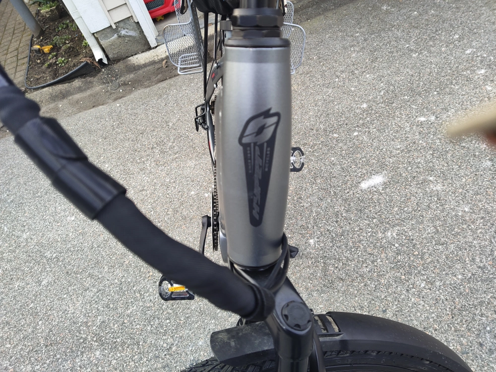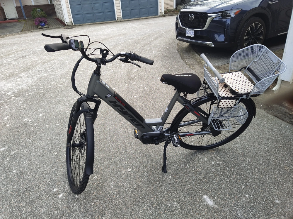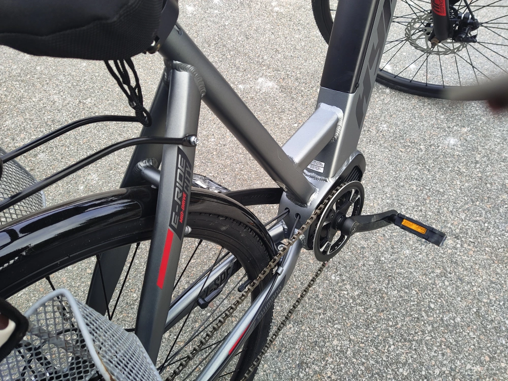 Electric bike with rear seat. Grey and red in colour.Aluminum alloy body, disc brake