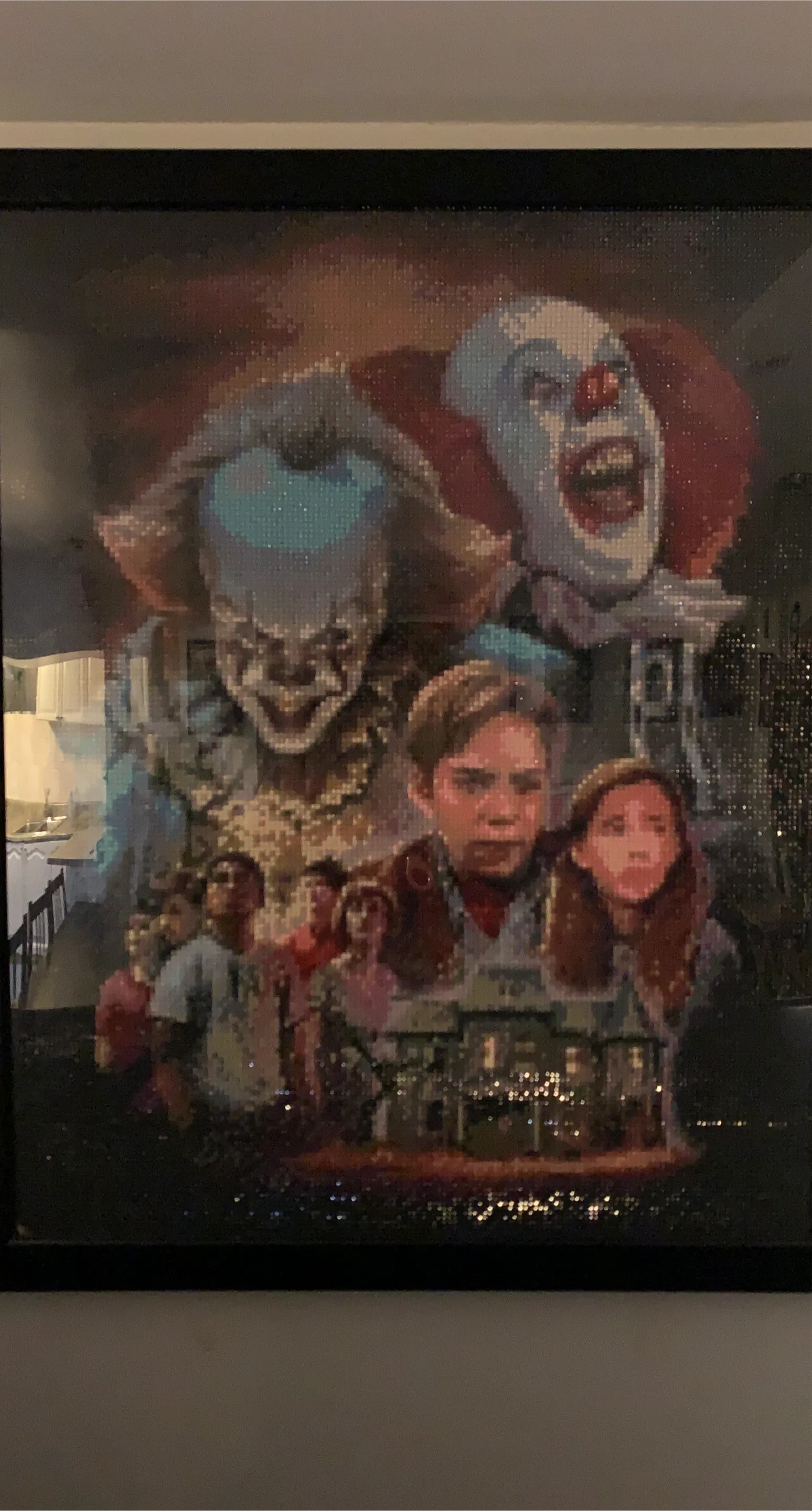 A framed diamond painting featuring characters from the IT movie. The artwork depicts Pennywise the clown and the Losers' Club. It's a unique piece for horror movie fans. Great for a home theatre or fan room!