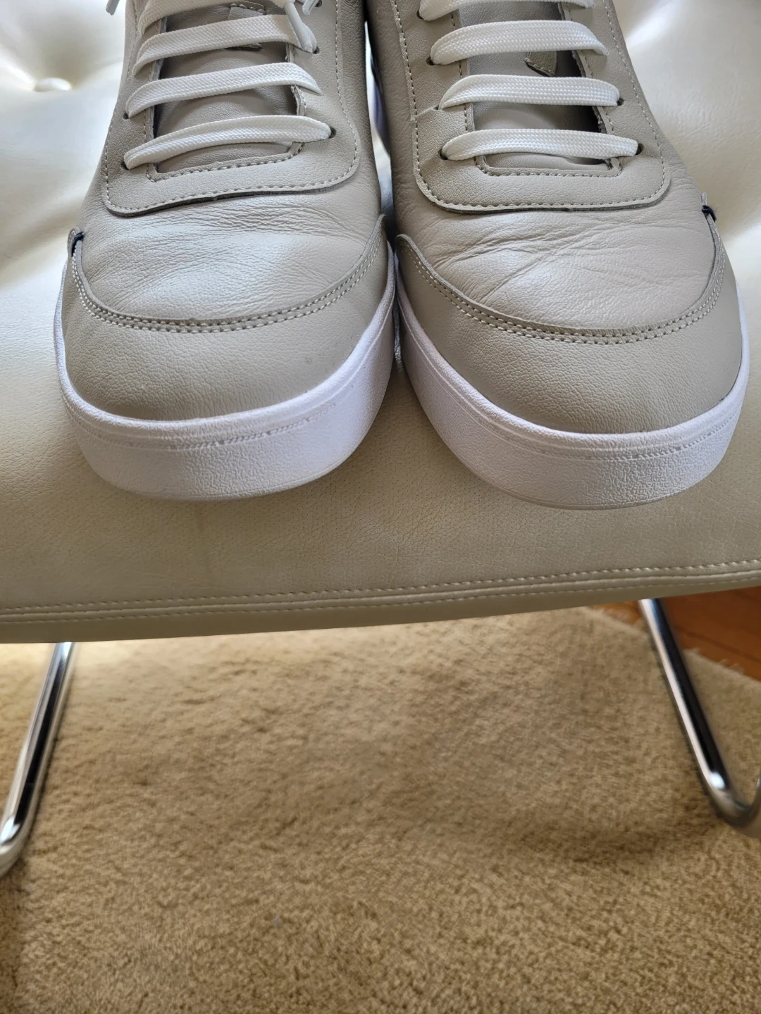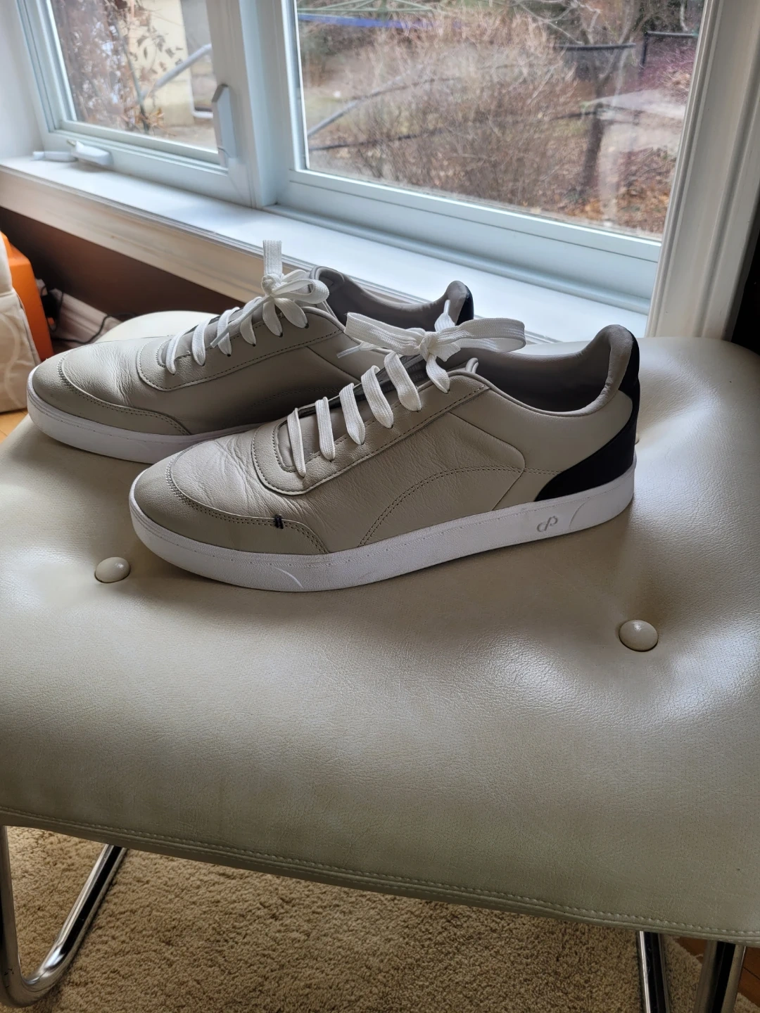 C/P by Puma stylish sneakers are crafted from genuine leather in a light grey colour. They feature white laces and a classic white sole. A dark navy accent is visible on the heel. Sz 12 extremely gently used. Clean and sanitized ready to wear.