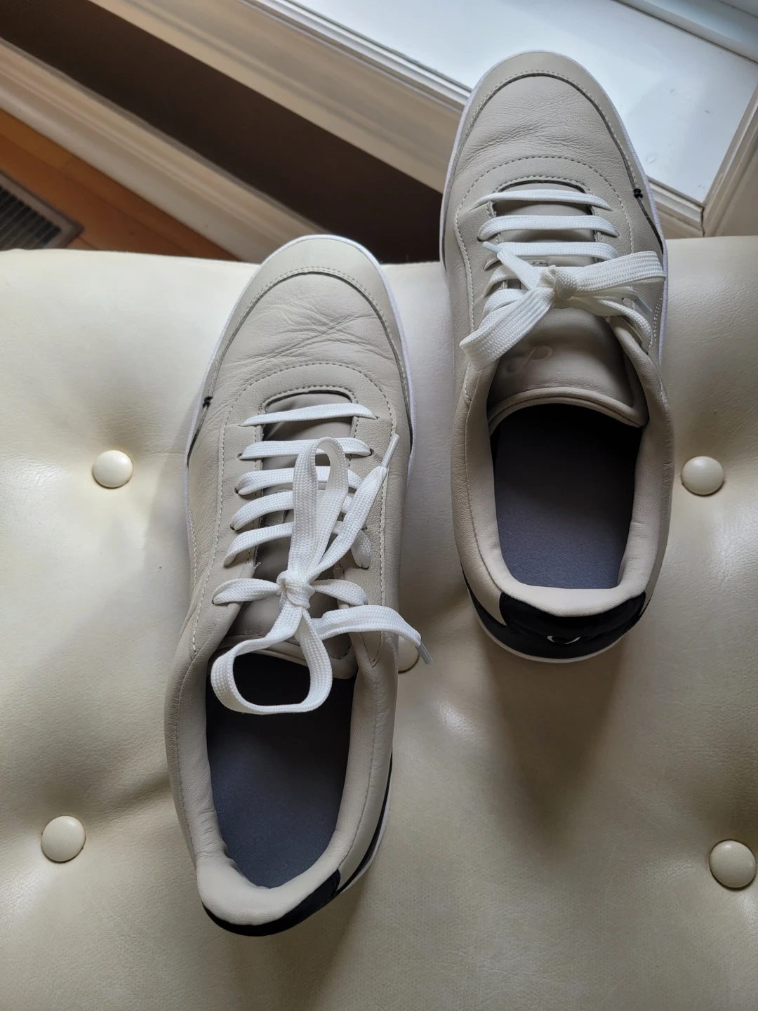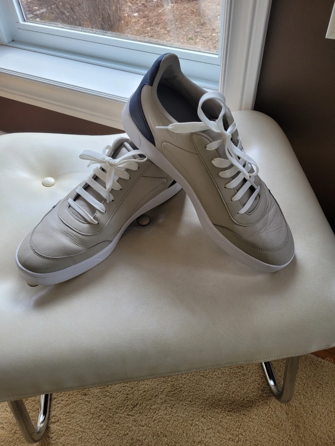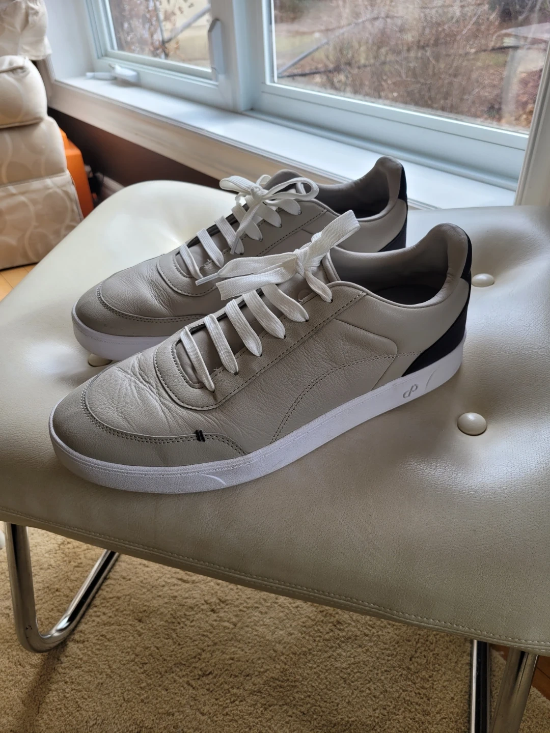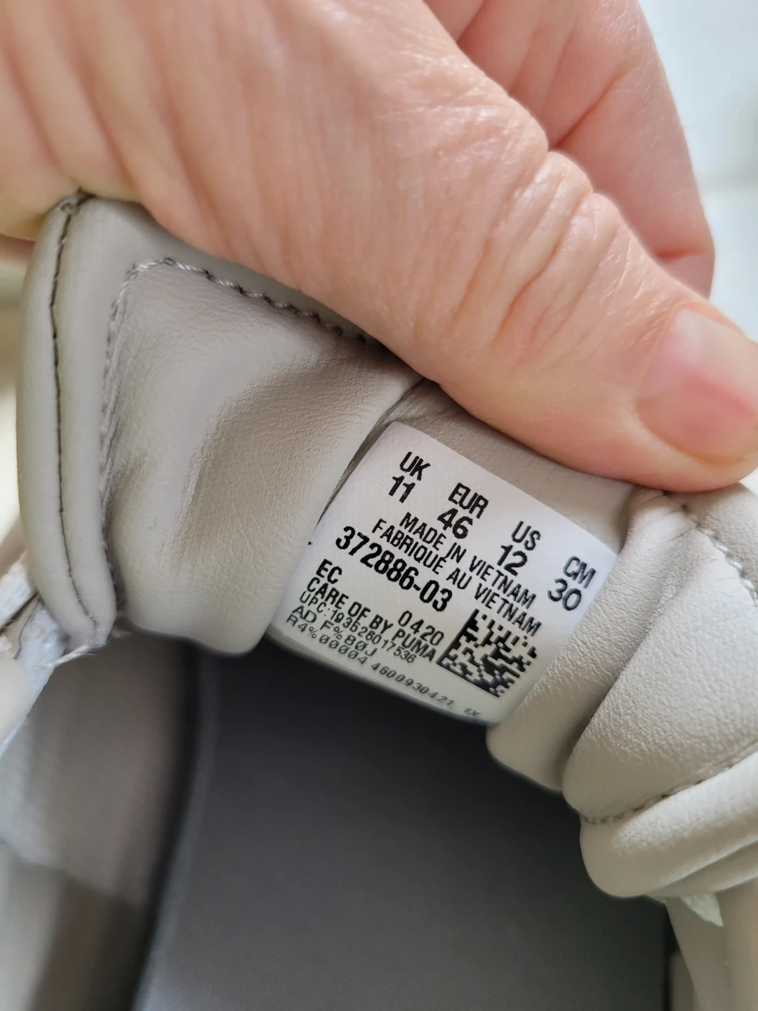 C/P by Puma stylish sneakers are crafted from genuine leather in a light grey colour. They feature white laces and a classic white sole. A dark navy accent is visible on the heel. Sz 12 extremely gently used. Clean and sanitized ready to wear.