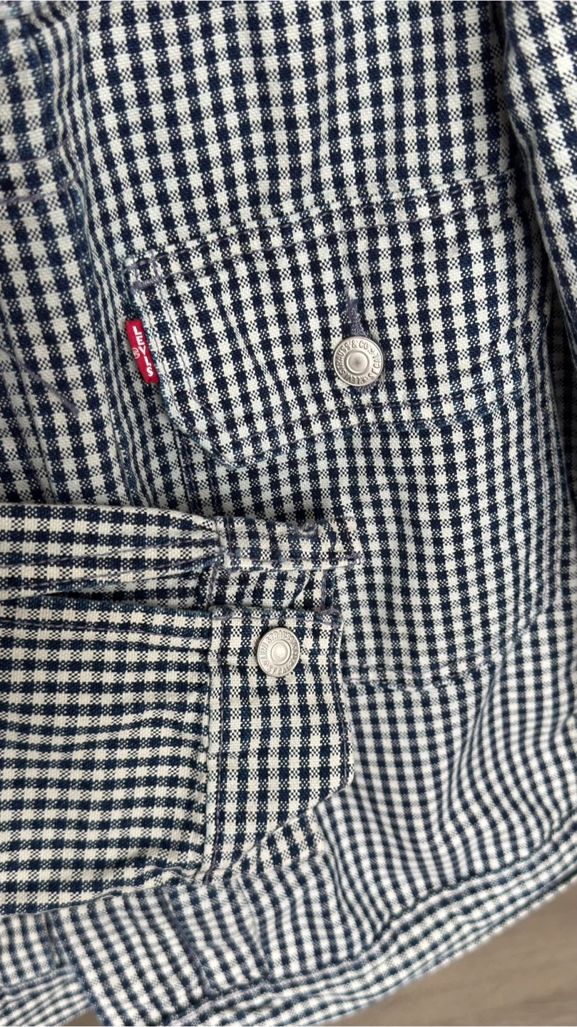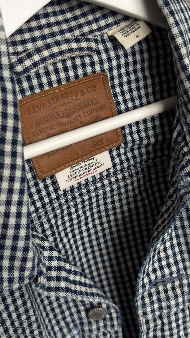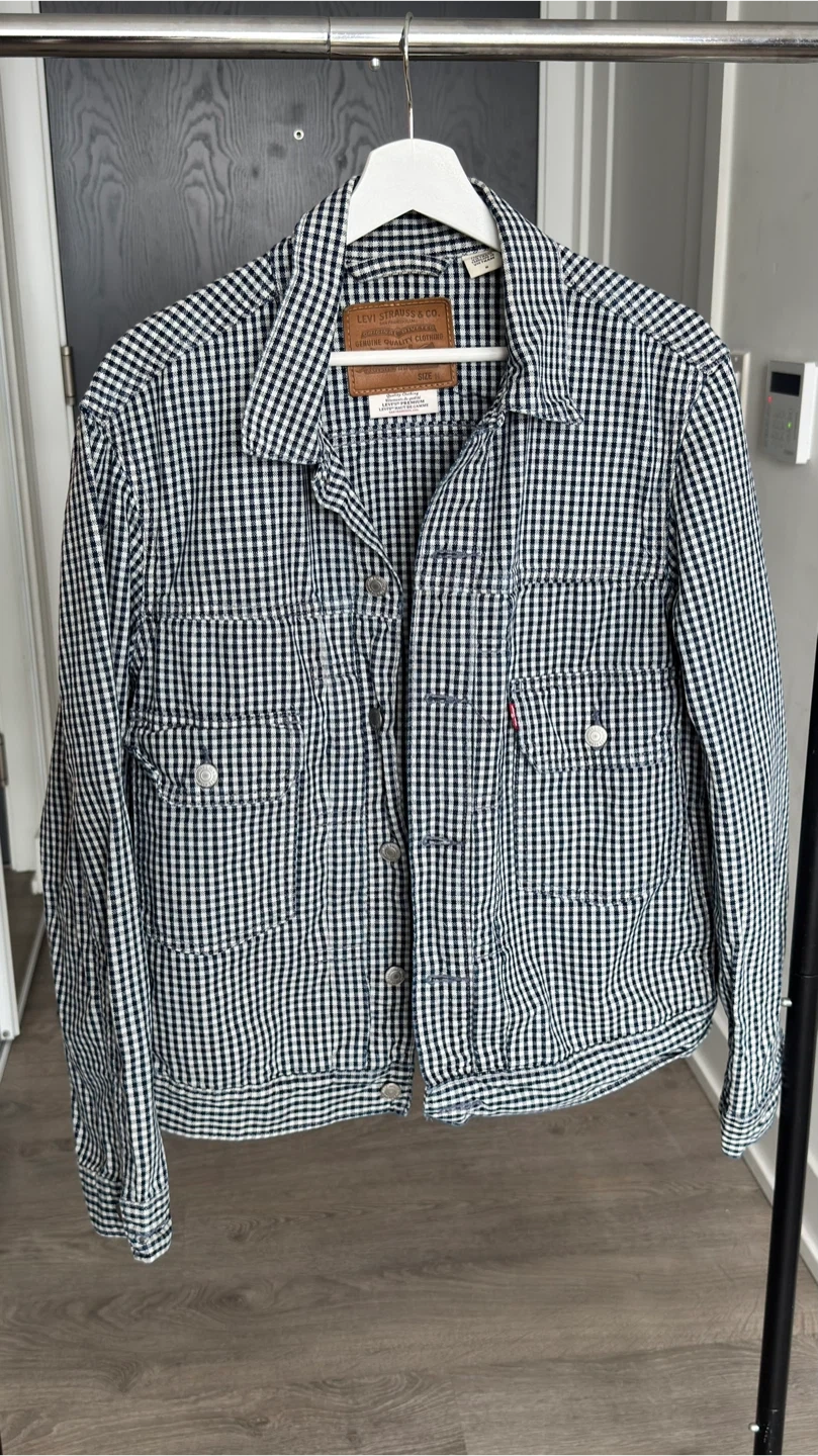 This is a Levi's trucker jacket with a classic gingham pattern. It's a size medium and made for genuine quality clothing. Buttons up the front with chest pockets.Price is firm