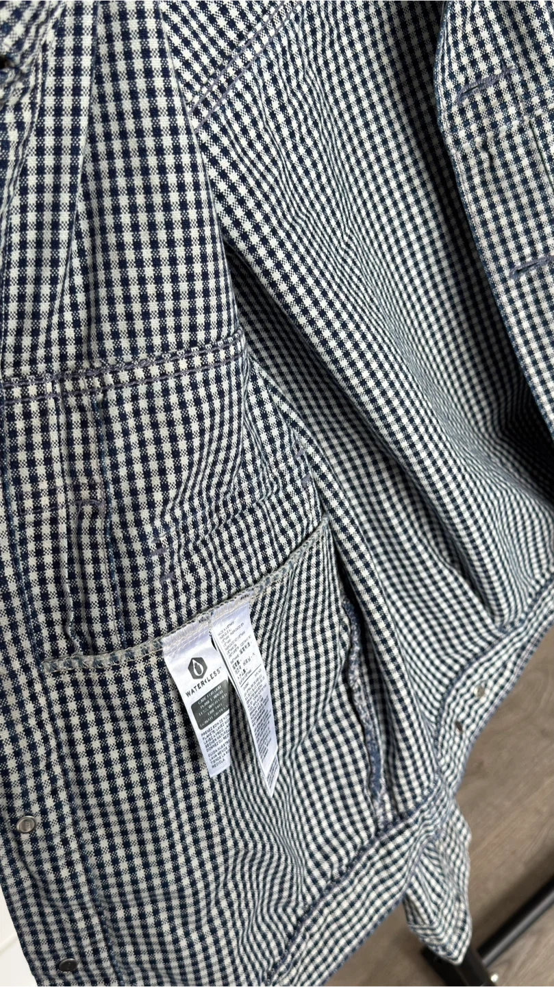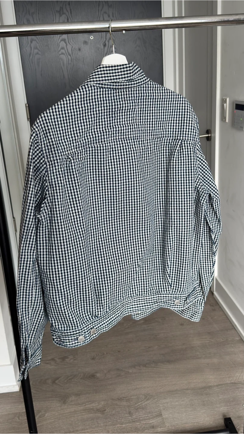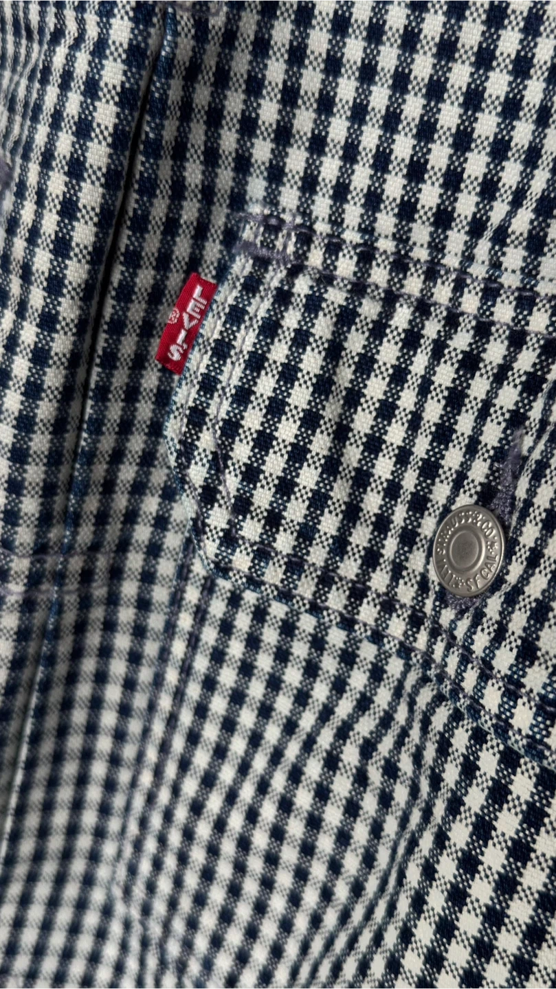 This is a Levi's trucker jacket with a classic gingham pattern. It's a size medium and made for genuine quality clothing. Buttons up the front with chest pockets.Price is firm