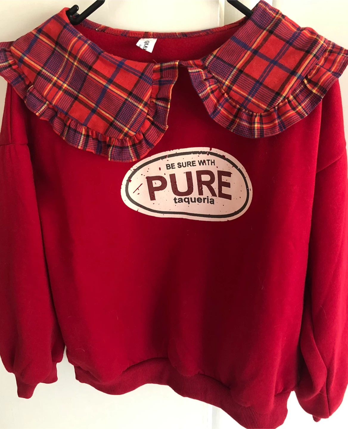 This comfy red crewneck sweatshirt features a fun plaid Peter Pan collar with ruffles. It has a graphic print on the front that says 'BE SURE WITH PURE taqueria'. It’s thick, perfect for winter.