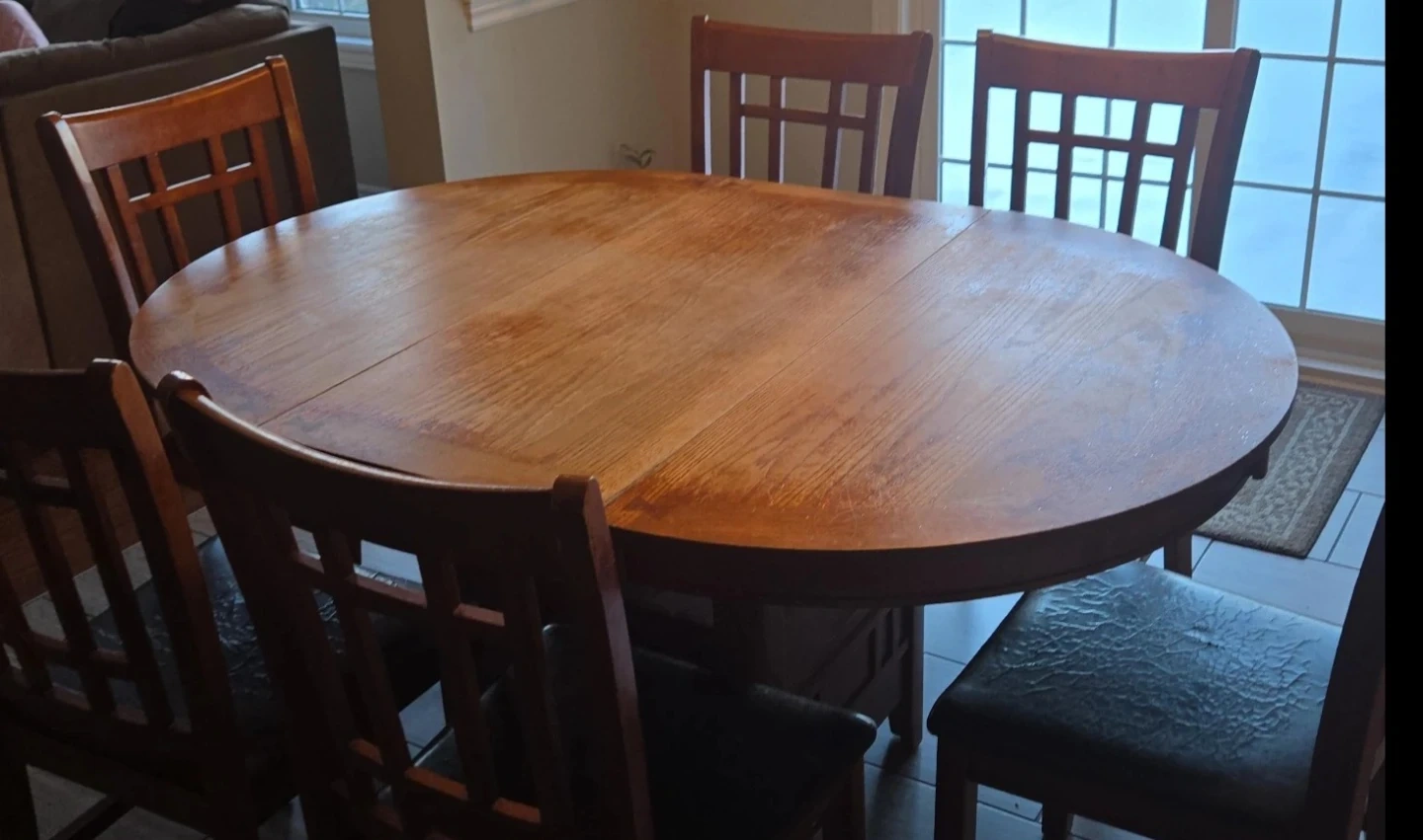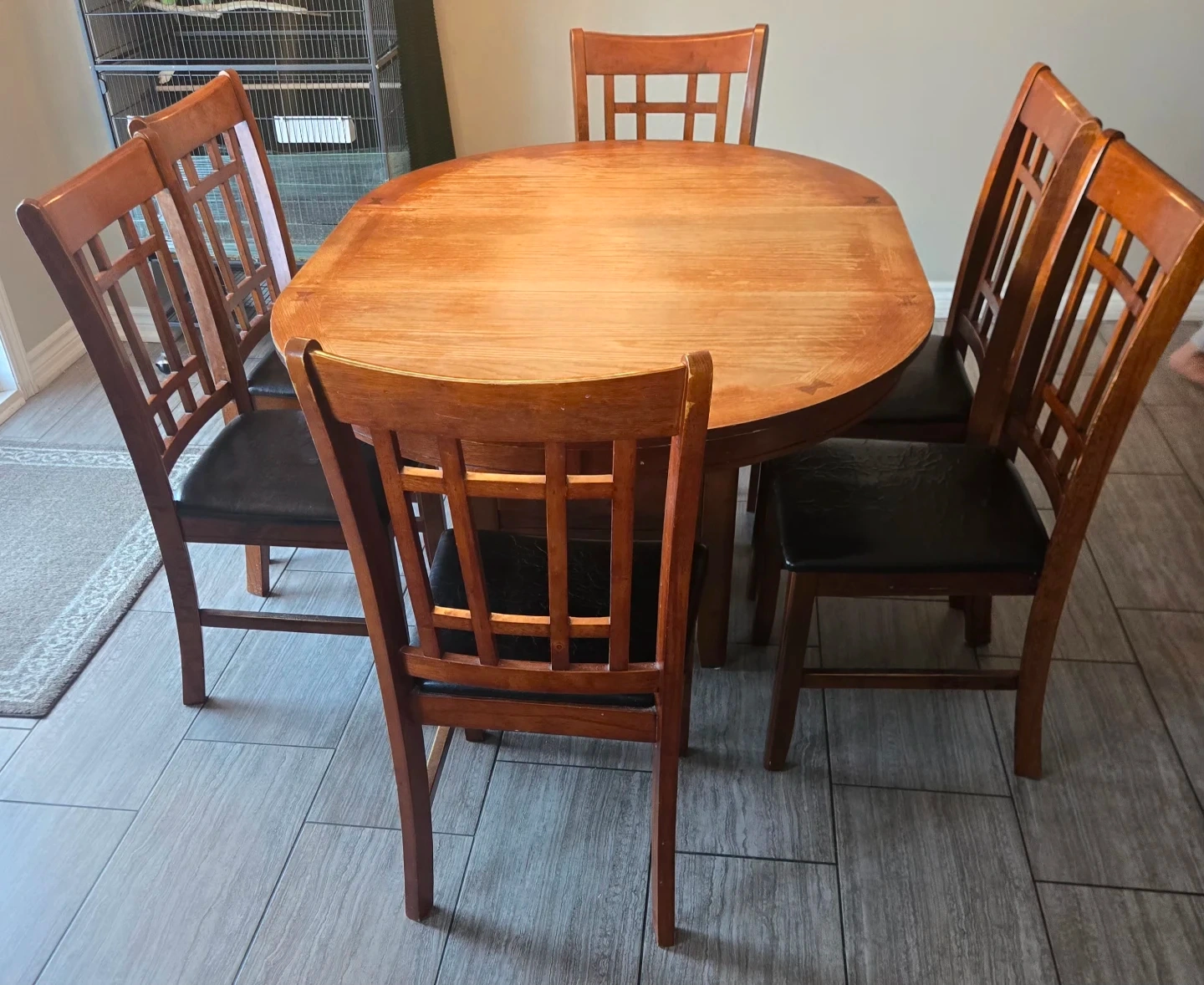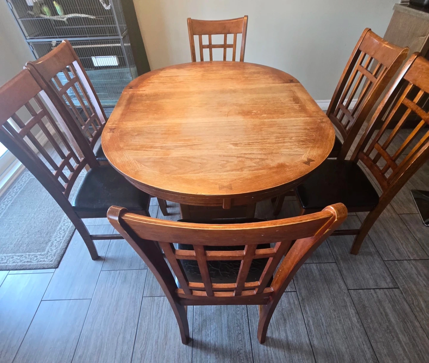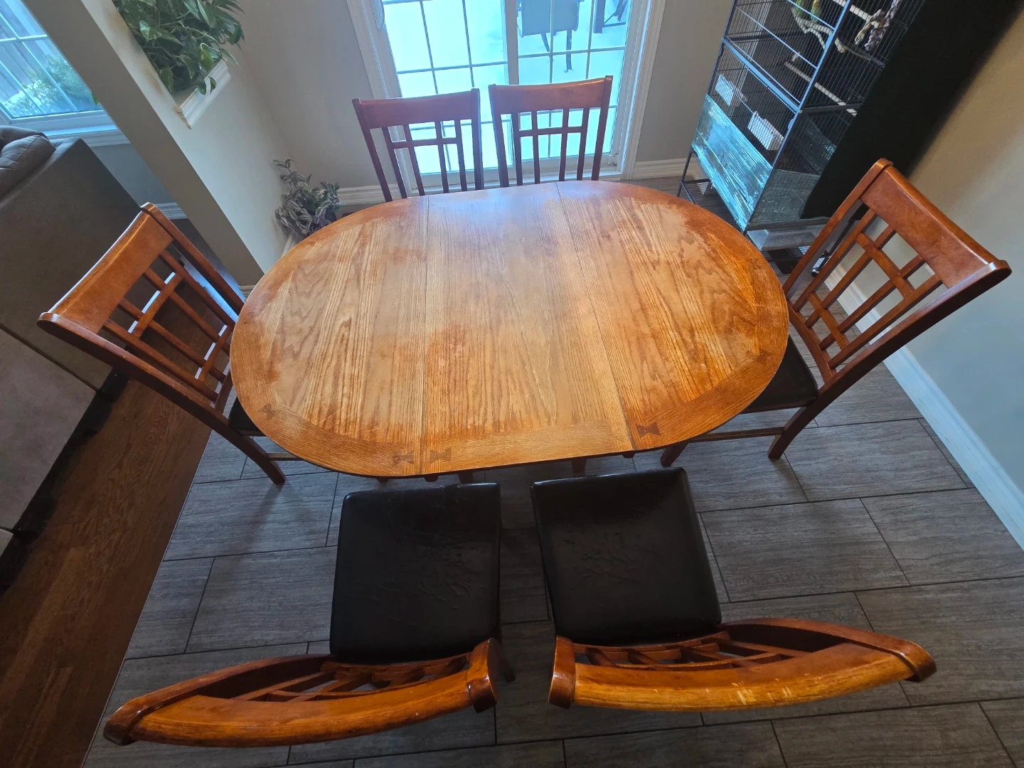 Selling a wooden 7 piece dining table with six chairs. The table has an oval shape and a classic design. The chairs have black leather seats and a wooden frame that matches the table.