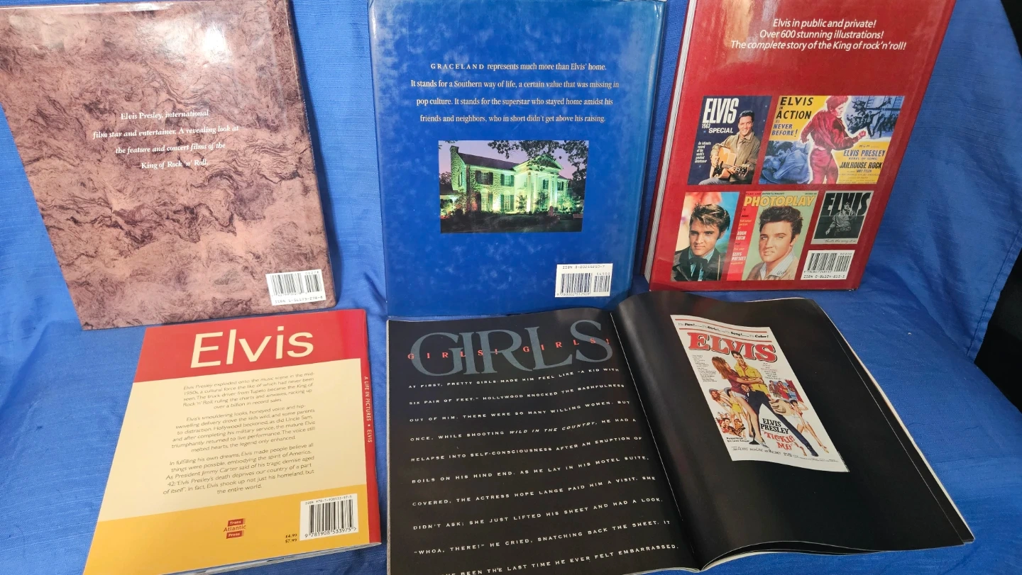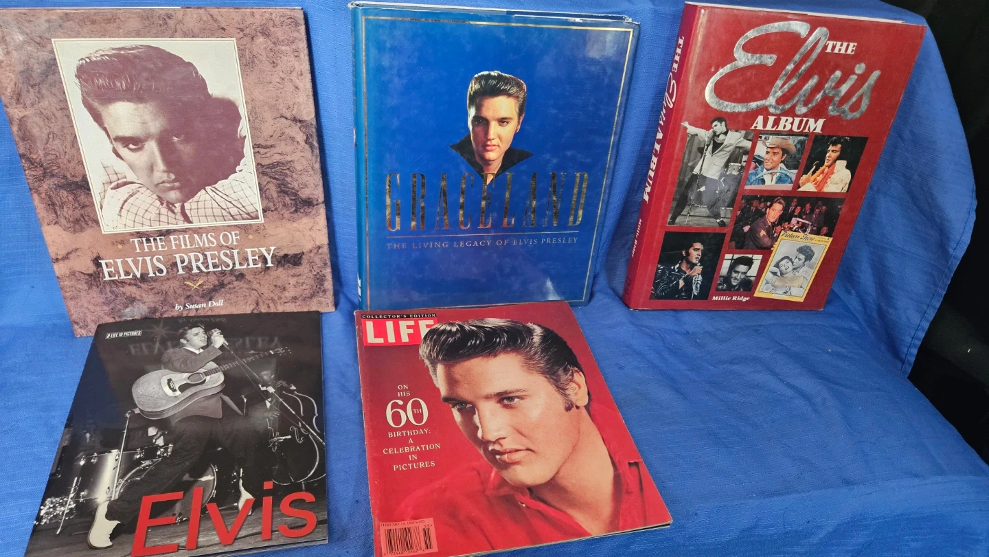 This lot includes five books and magazines all about Elvis Presley. It features 'The Films of Elvis Presley', 'Graceland: The Living Legacy of Elvis Presley', 'The Elvis Album' by Millie Ridge, a 'LIFE' magazine celebrating his 60th birthday, and a 'Girls' magazine with Elvis on the cover. These publications cover his career and life.