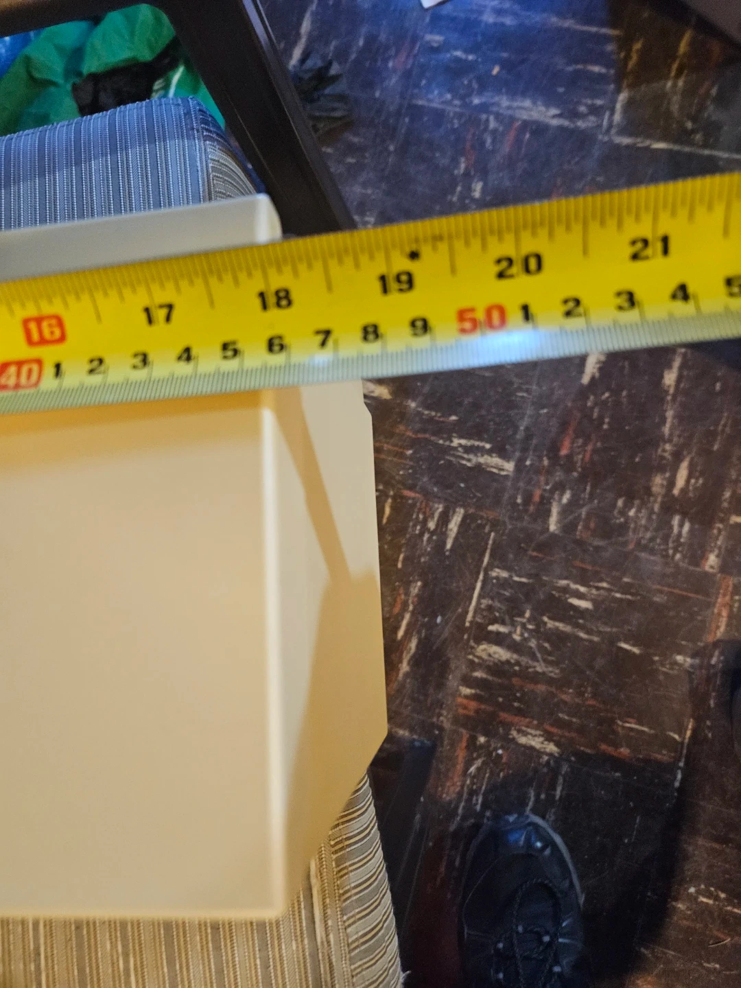 Holds approximately 50 CDs in their jewel cases. Beige plastic construction with a hinged lid. Case measures roughly 17 inches long and 6 inches deep. It's great for keeping your CD collection tidy!