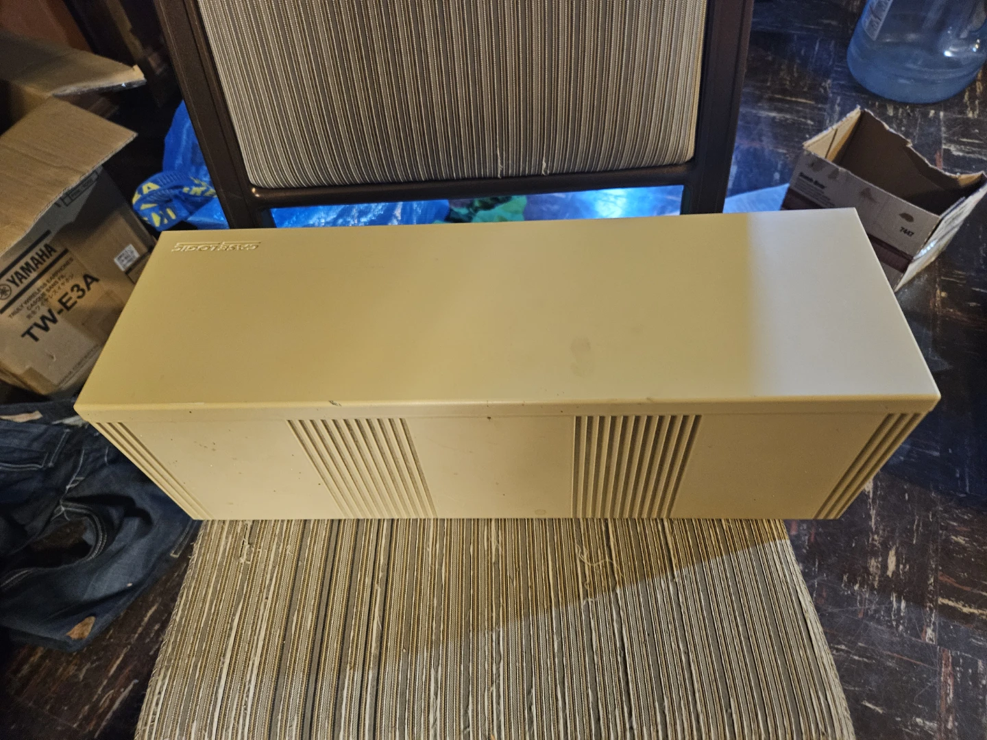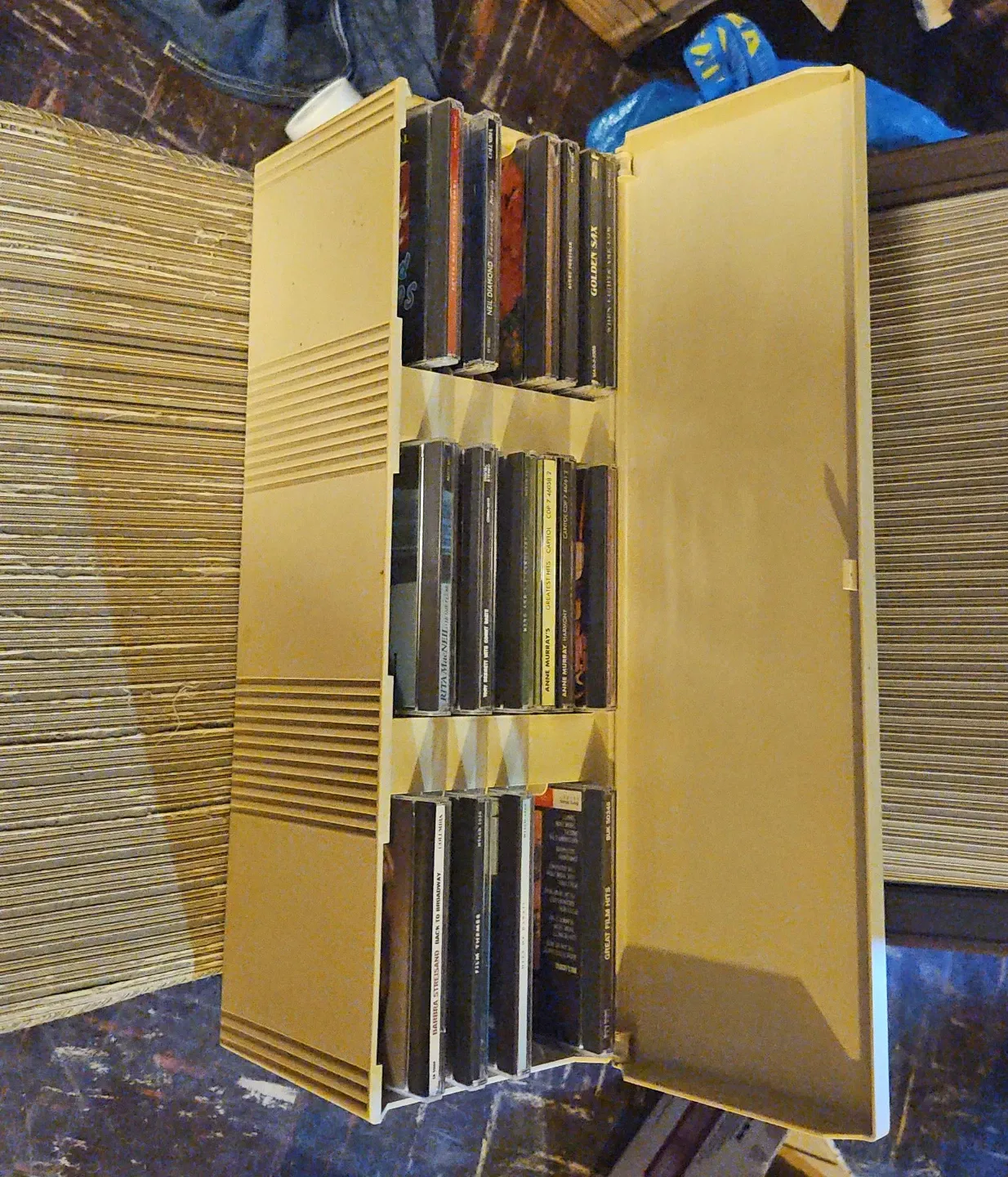 Holds approximately 50 CDs in their jewel cases. Beige plastic construction with a hinged lid. Case measures roughly 17 inches long and 6 inches deep. It's great for keeping your CD collection tidy!