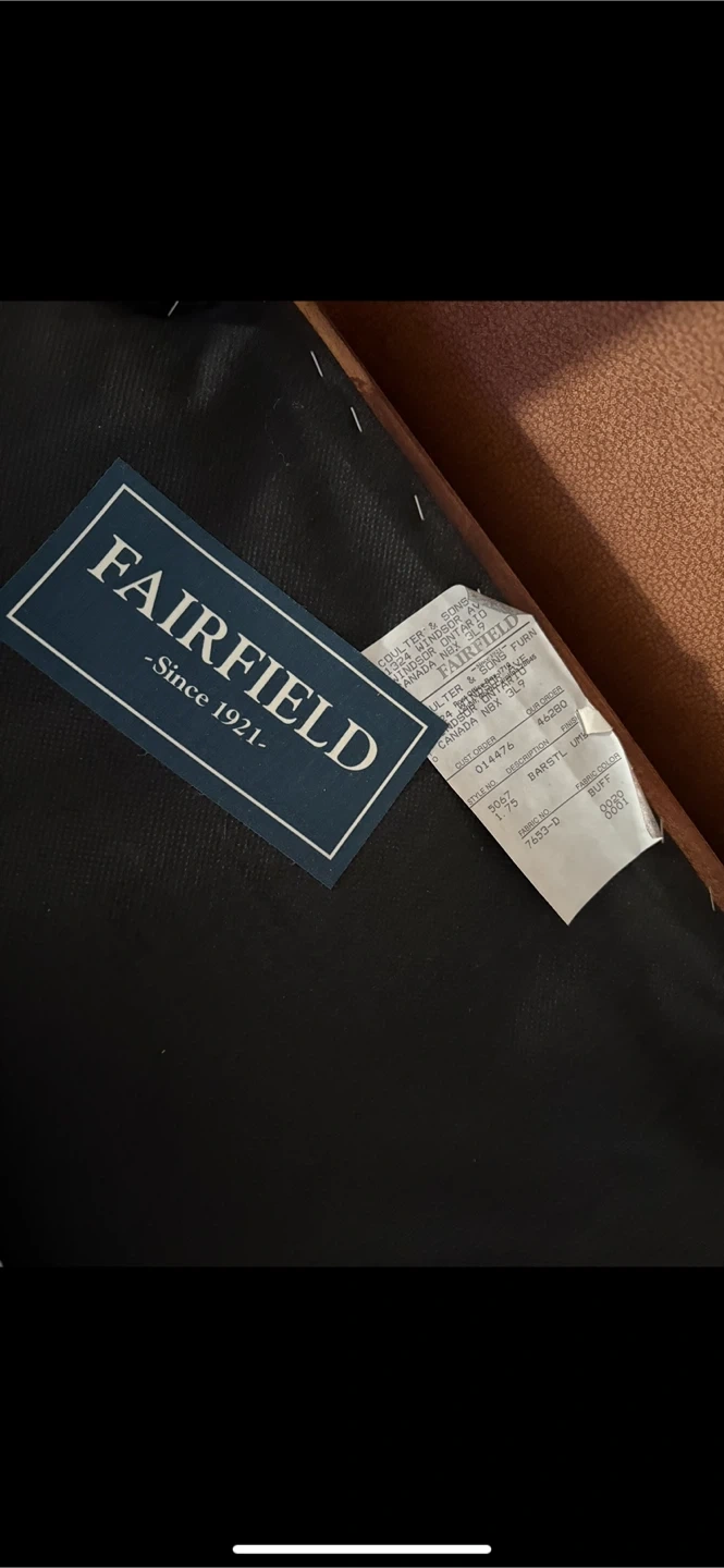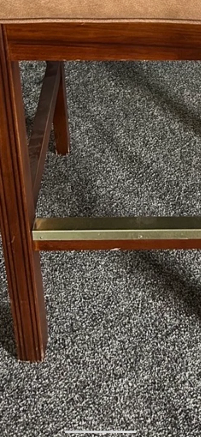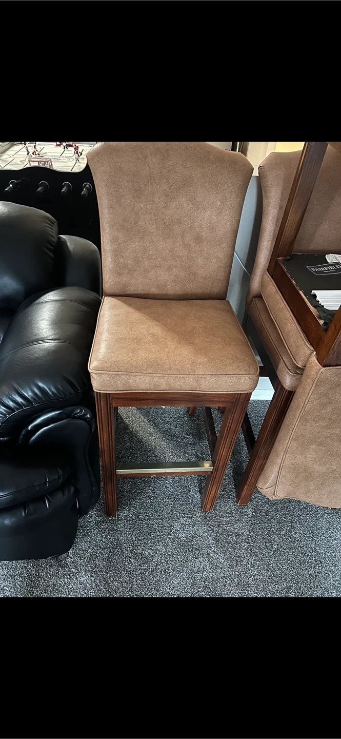 9 bar stool chairs by Fairfield with comfortable faux leather upholstery. Features a warm brown finish and sturdy wood frame. It's got a handy brass footrest. A bit scuffed but good condition otherwise. $25 each or $200 for all 9.